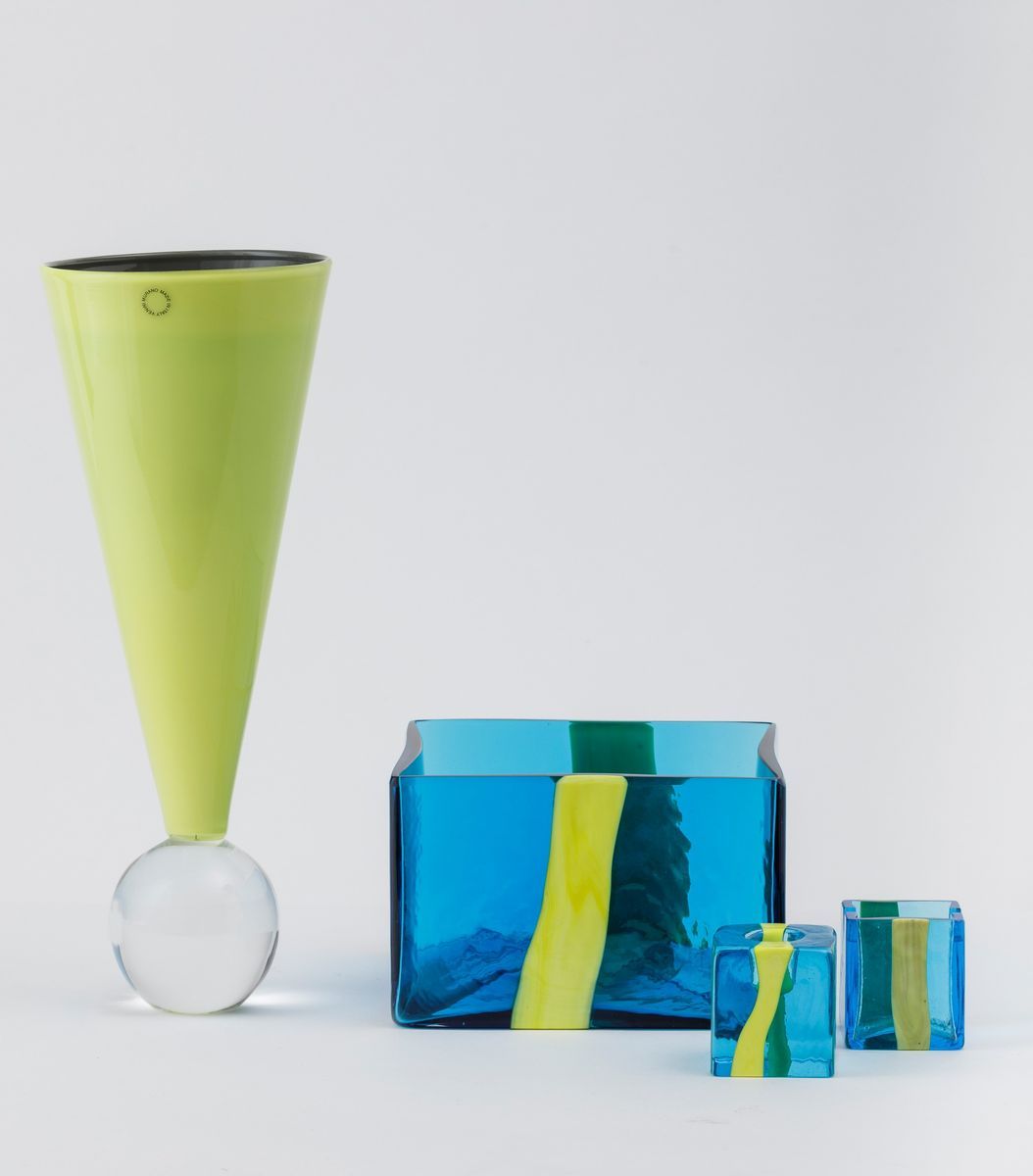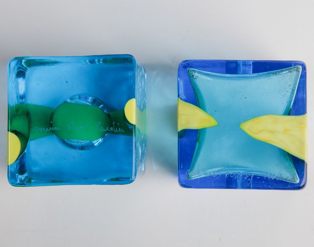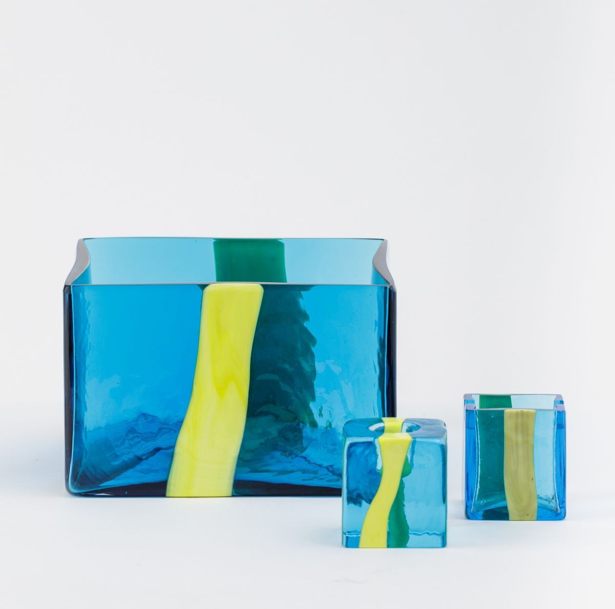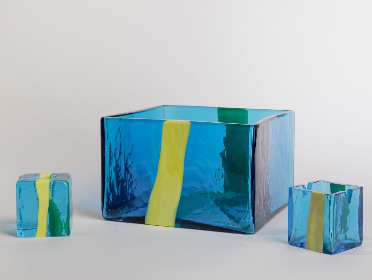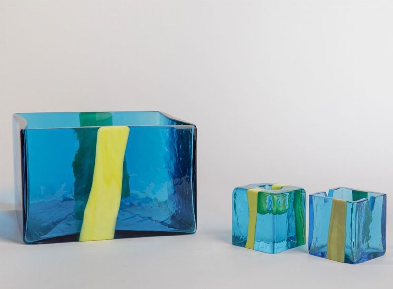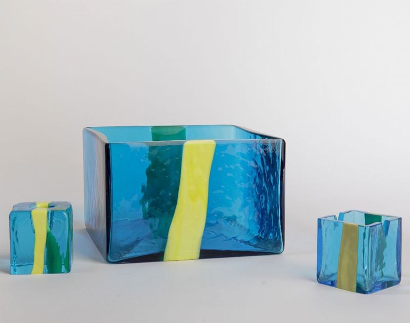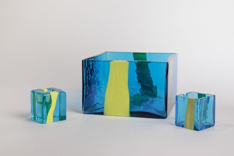 Un vaso quadrato, un posacenere ed un candeliere in vetro soffiato bluino con decoro di fascia in vetro opaco zolfo.