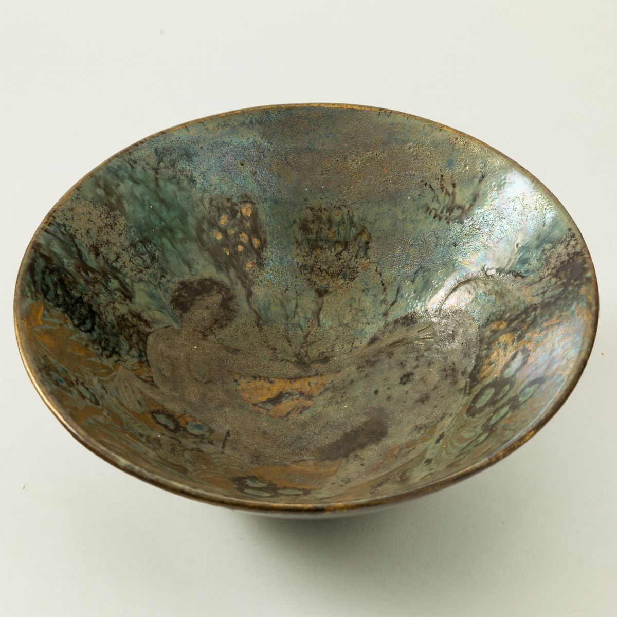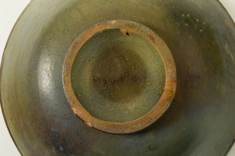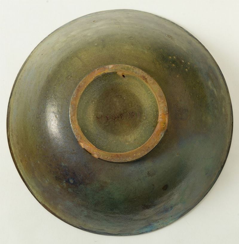Grande coppa in terracotta maiolicata con decoro di sirena a rilievi su fondo marino. Smalti policromi, lustri e dorature.