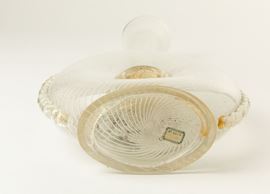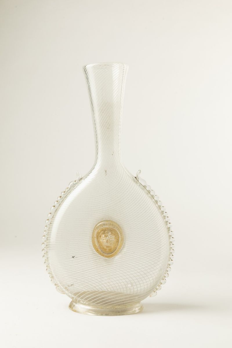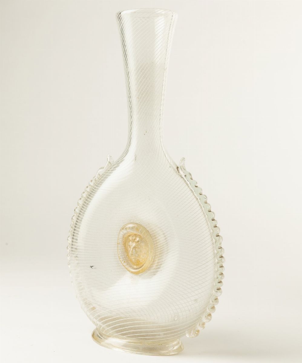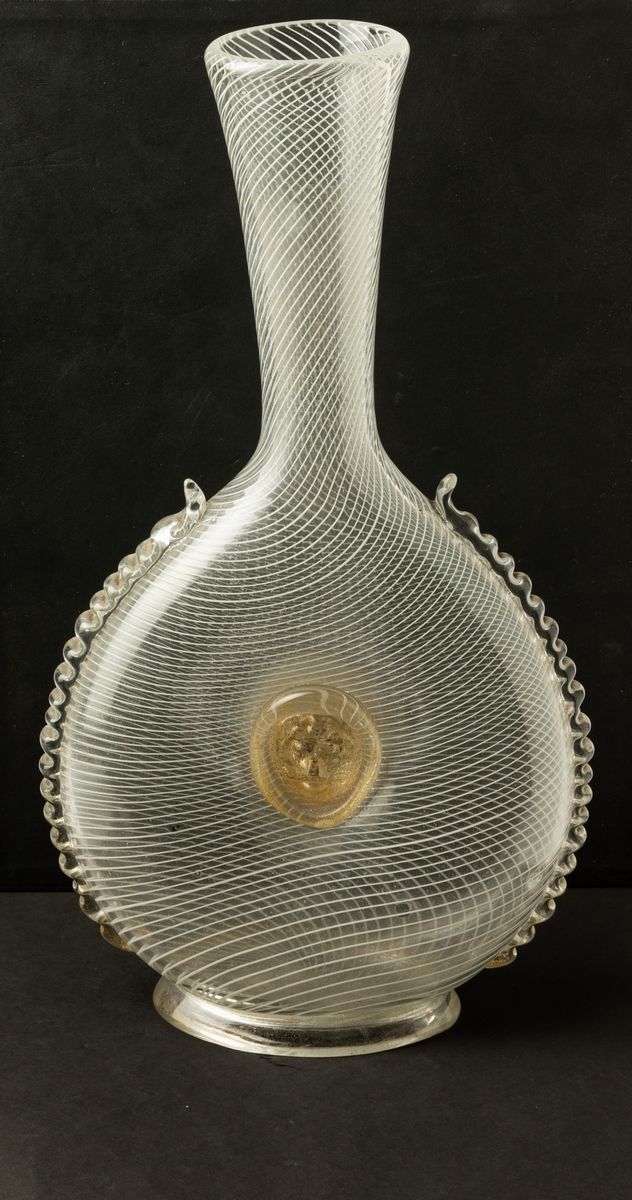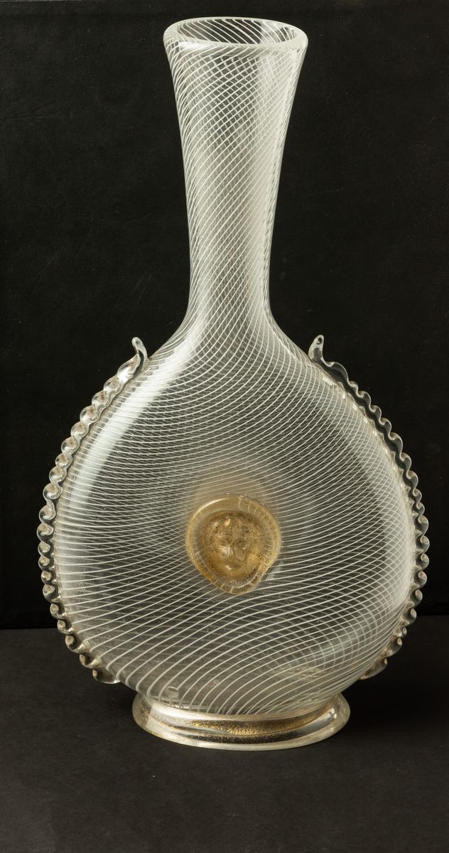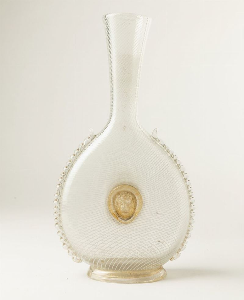 Rara fiasca con lungo collo svasato in vetro a reticello sommerso lattimo con anse a serpentina e piede applicati. Medaglioni a testa di leone incussi con foglia oro