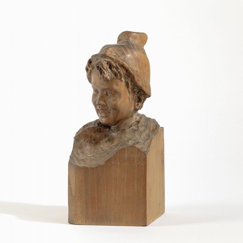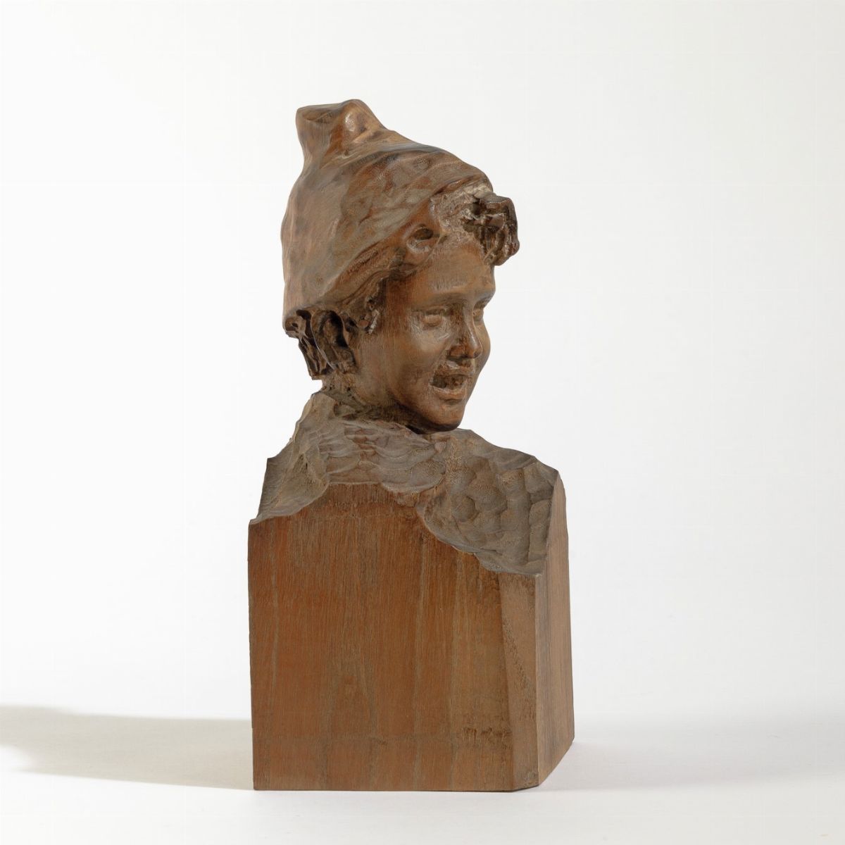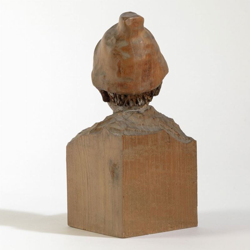 Testa di giovinetto con cappello scolpita entro blocco di legno a sezione quadrata.