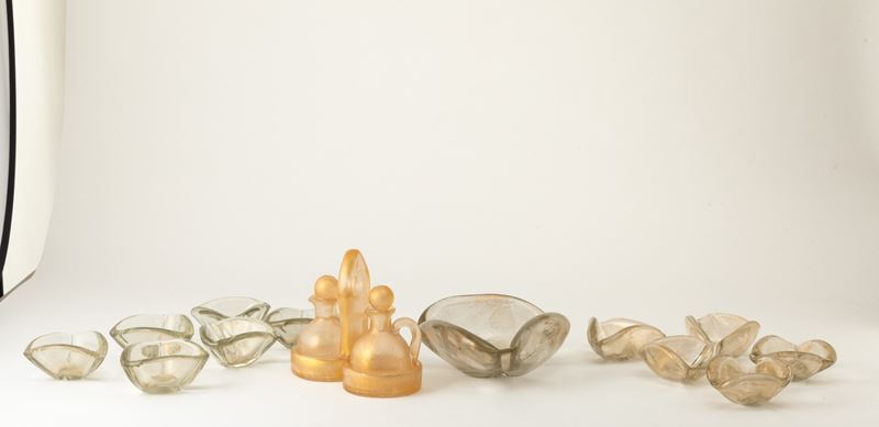 Servizio da tavola da pinzimonio formato da oliera, con due bottiglie in vetro corroso con decoro di foglia d’oro, una ciotola triangolare in vetro pesante e foglia d’oro con undici coppette en suite.