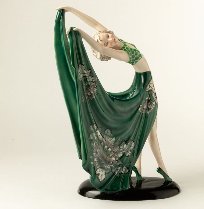 Figura in danzatrice in terraglia a colaggio con ricco abito con decoro in policromia