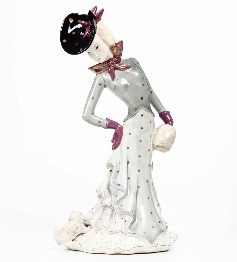 Figura di donna con piccolo cane e manicotto in terraglia a colaggio con decoro di dorature e smalti policromi.
