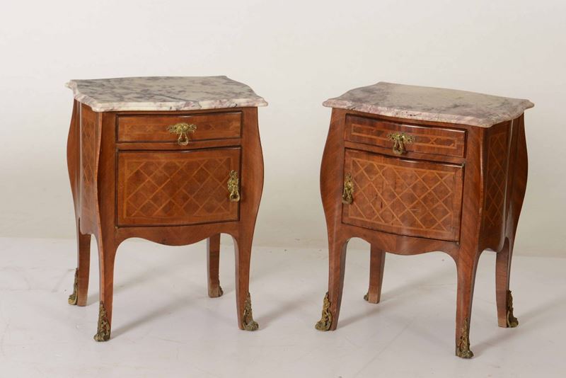 Scrivania e due comodini in legno lastronato ed intarsiato