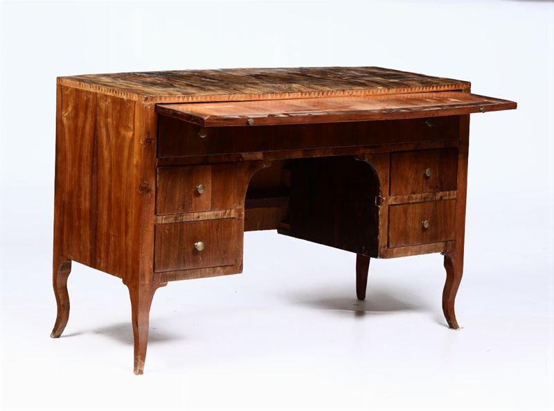 Scrivania in legno impiallacciato a cinque cassetti, XIX secolo