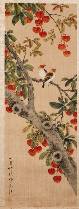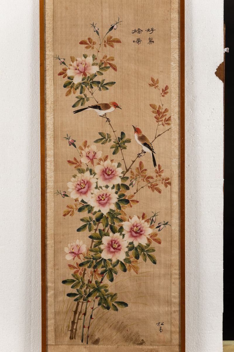 Due dipinti su seta raffiguranti soggetti naturalistici con uccellini tra i rami e iscrizioni, Cina, XX secolo