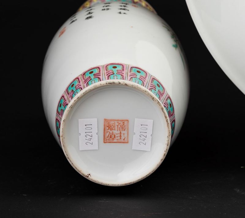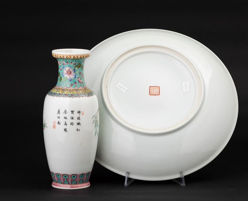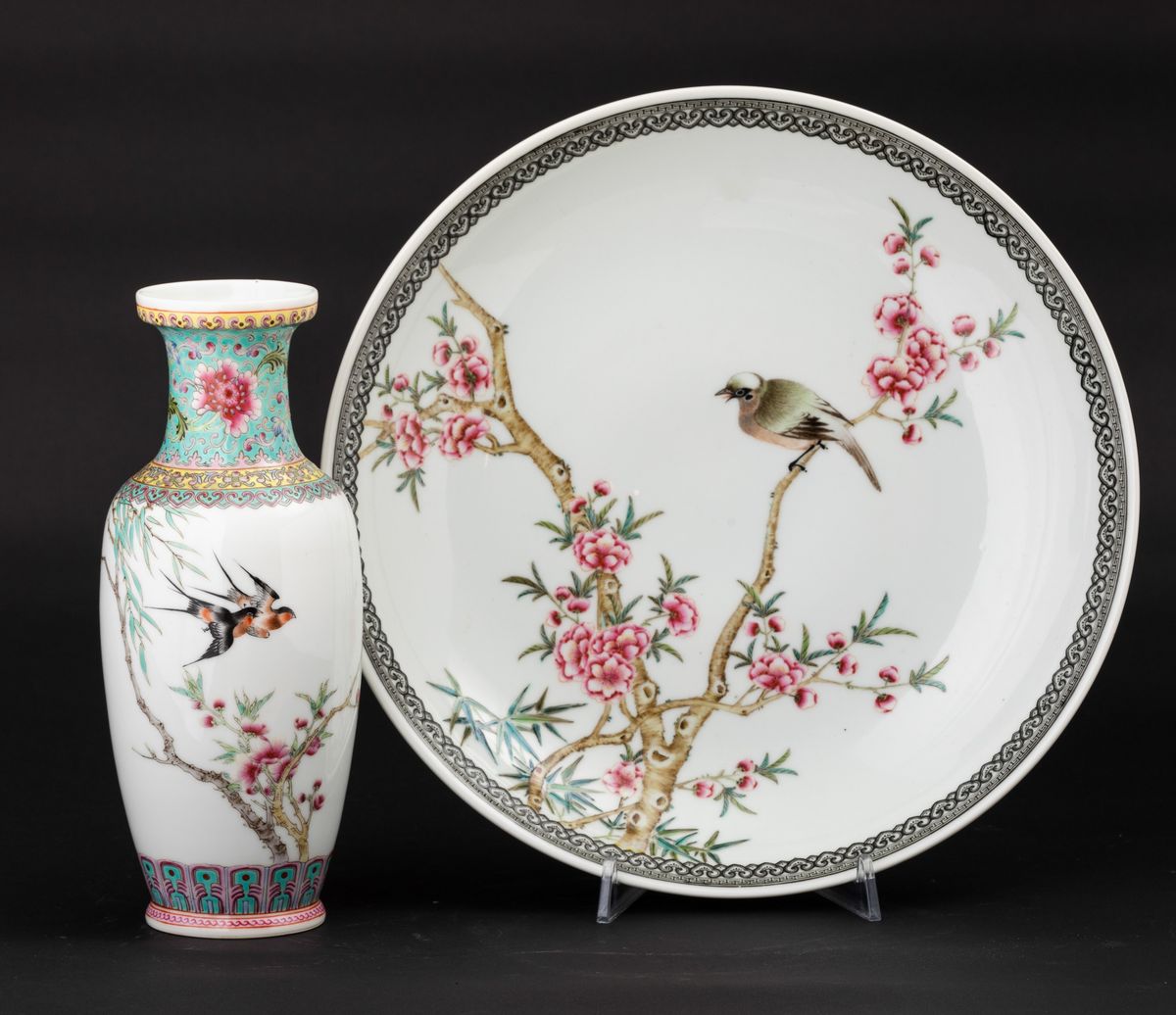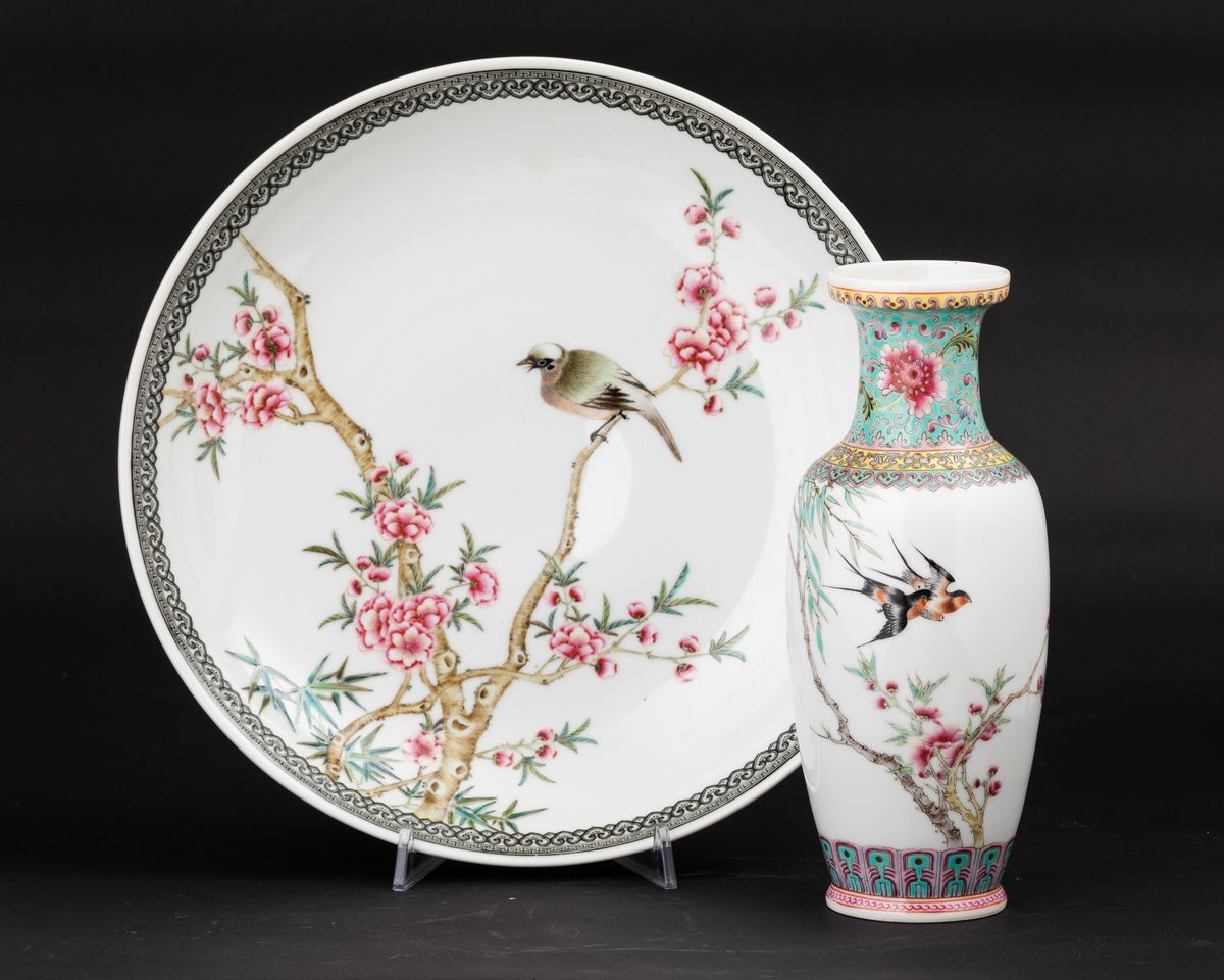 Lotto composto da un piatto e un vaso in porcellana con decoro di uccellini tra i rami, Cina, Repubblica, XX secolo
