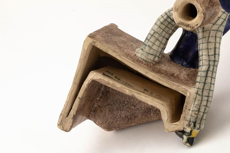 Scultura in terracotta maiolicata con decoro policromo.