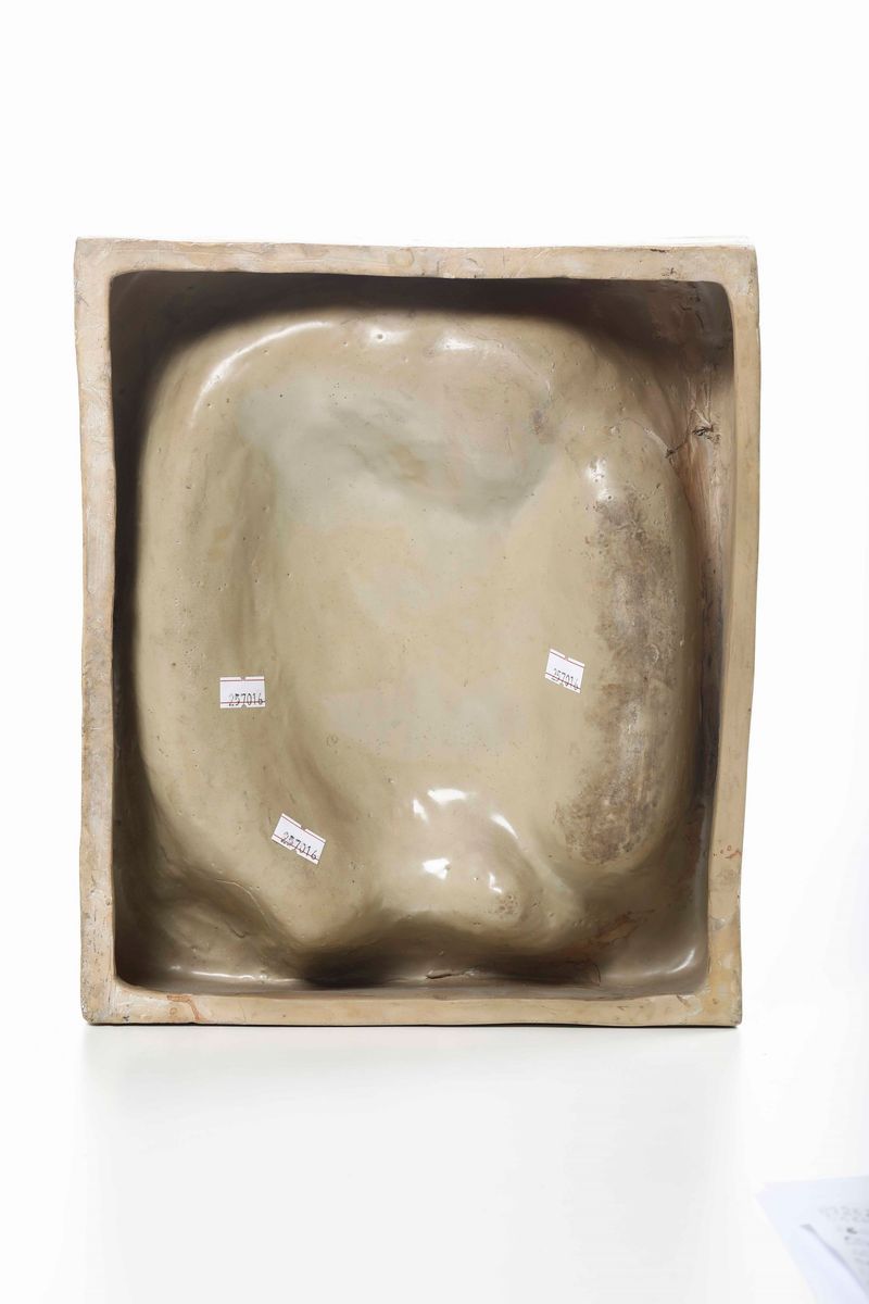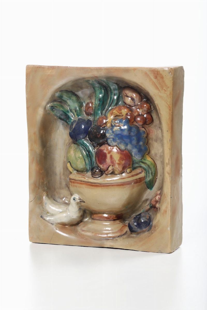 Placca rettangolare in terracotta maiolicata raffigurante vaso con fiori e frutta e colomba in bassorilievo decorata a smalti policromi