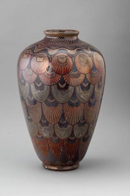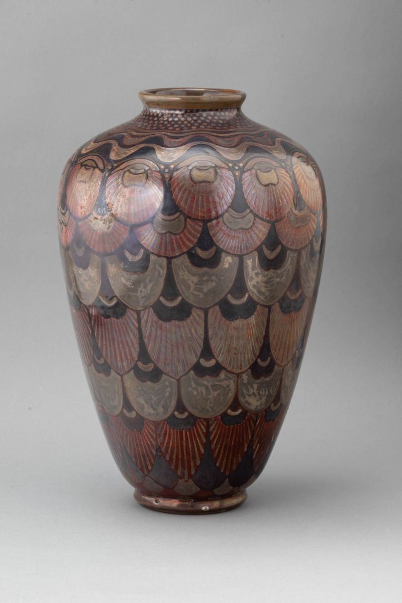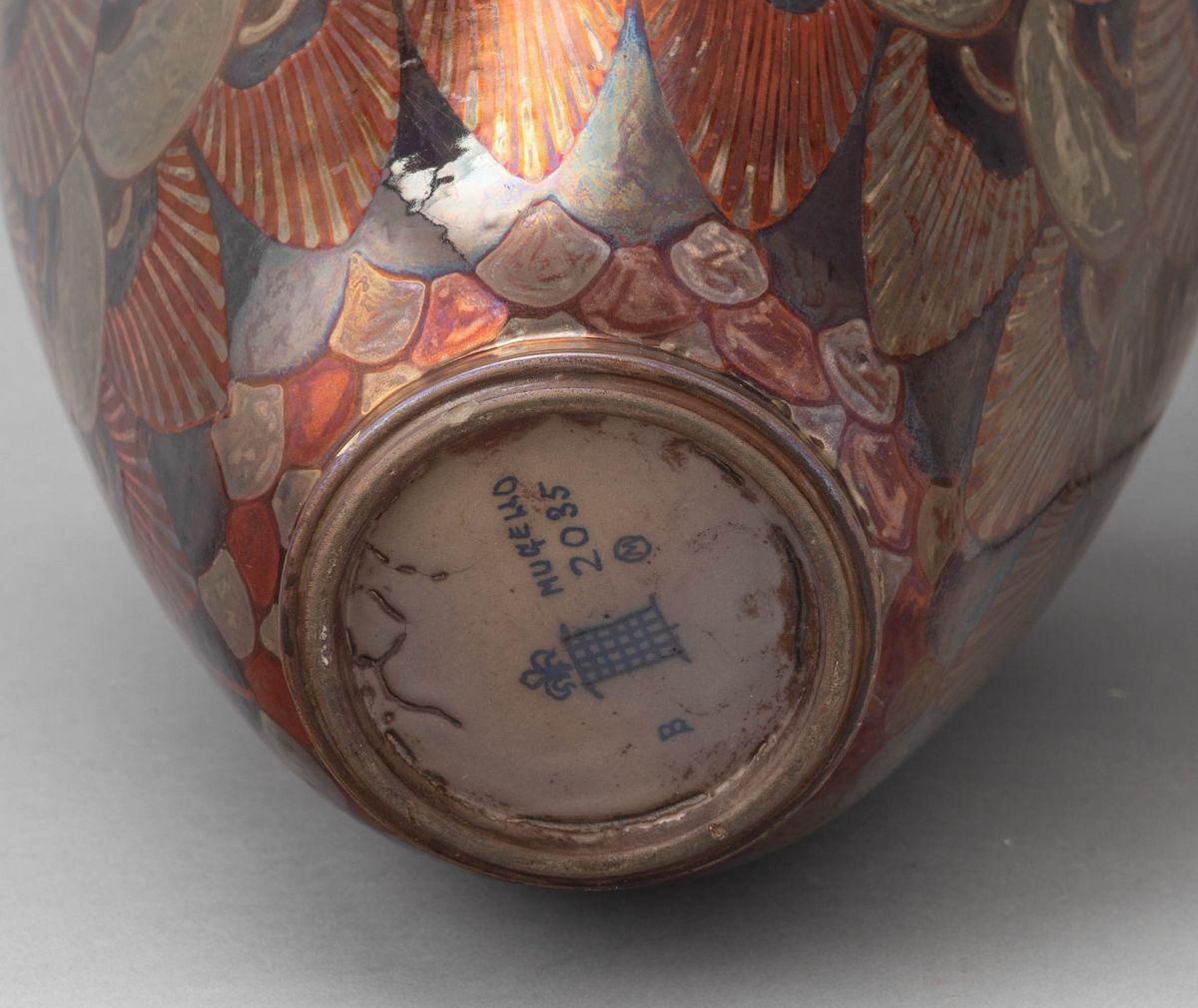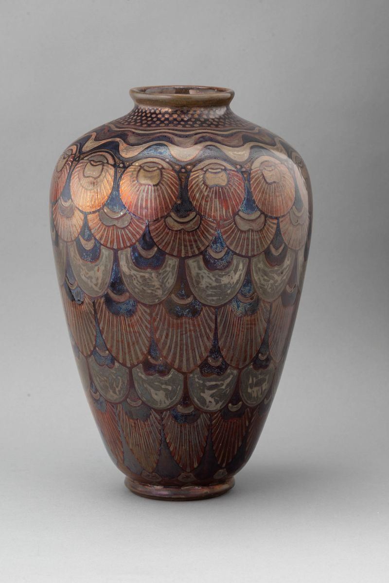 Vaso a uovo in ceramica con decoro di scaglie e piume di pavone a lustri policromi
