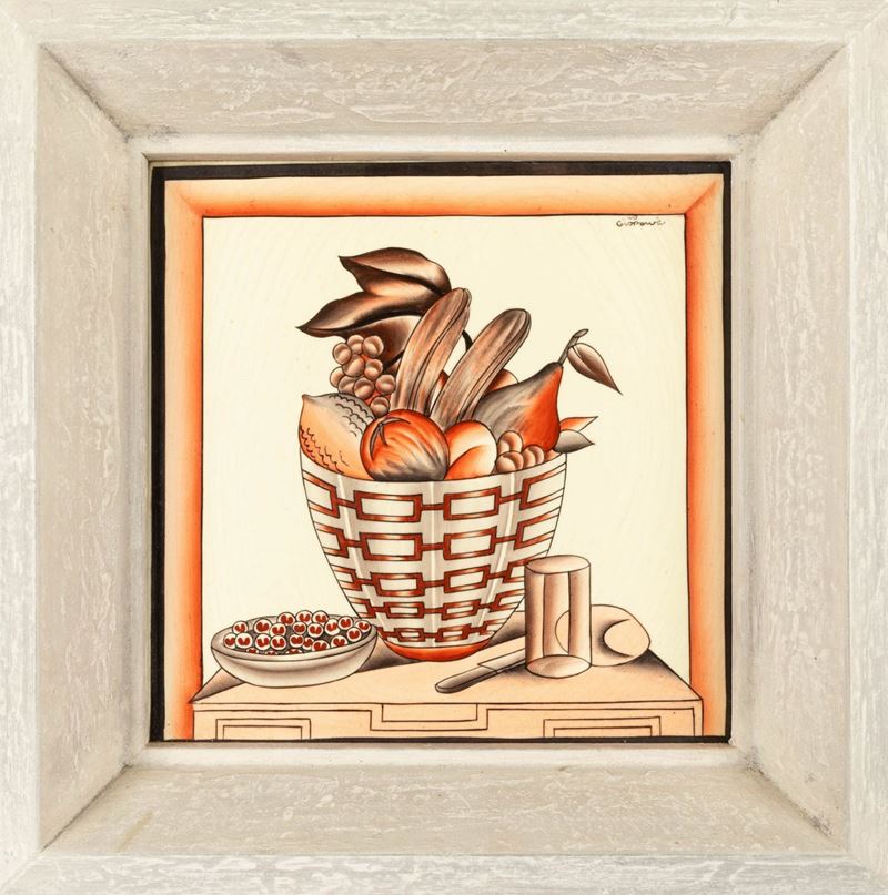 Grande placca decorativa in terraglia con decoro di natura morta a smalti policromi