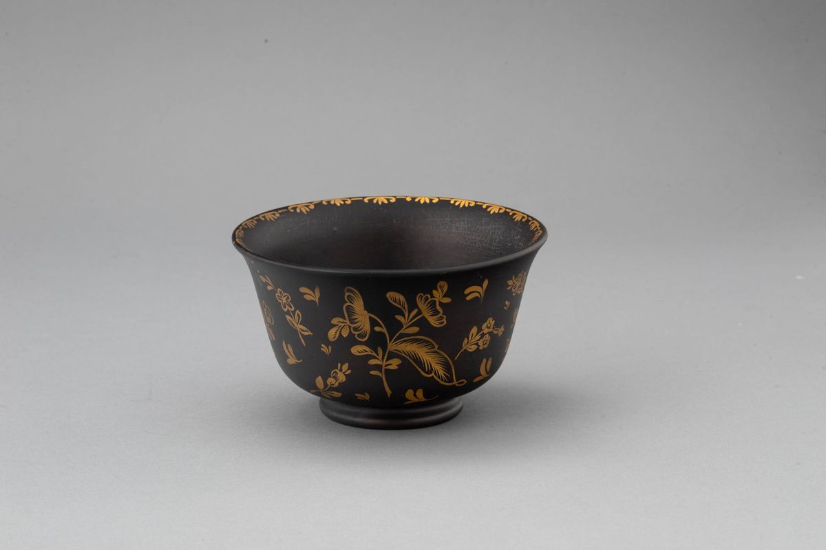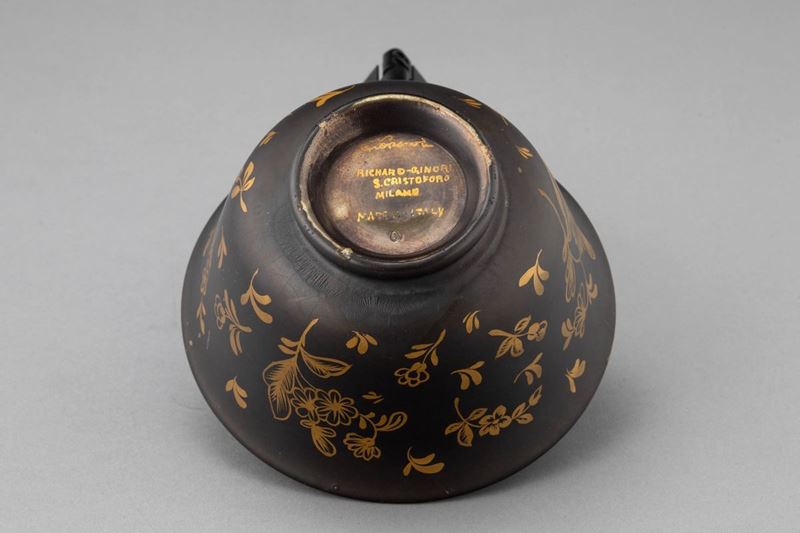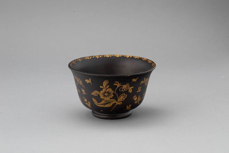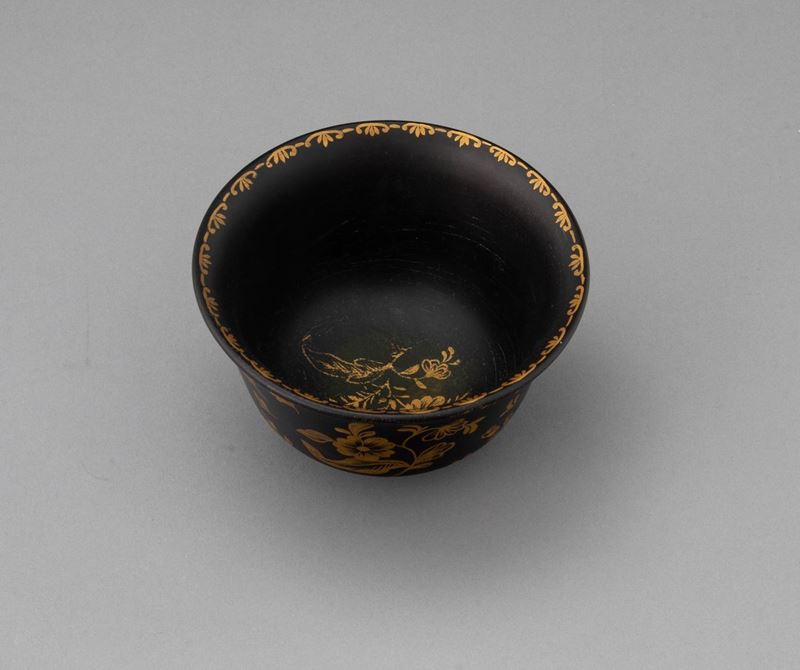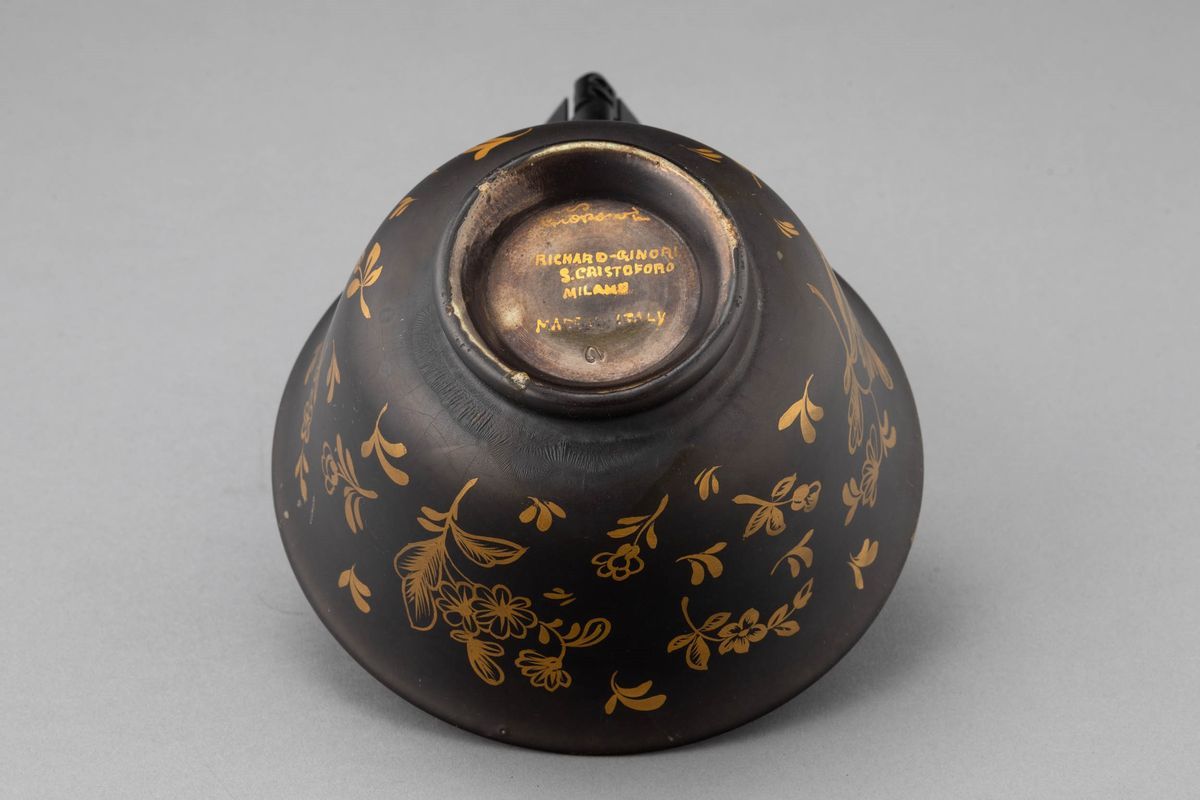 Coppa in terraglia a colaggio con decoro di fiori in oro graffito su fondo nero lucido.