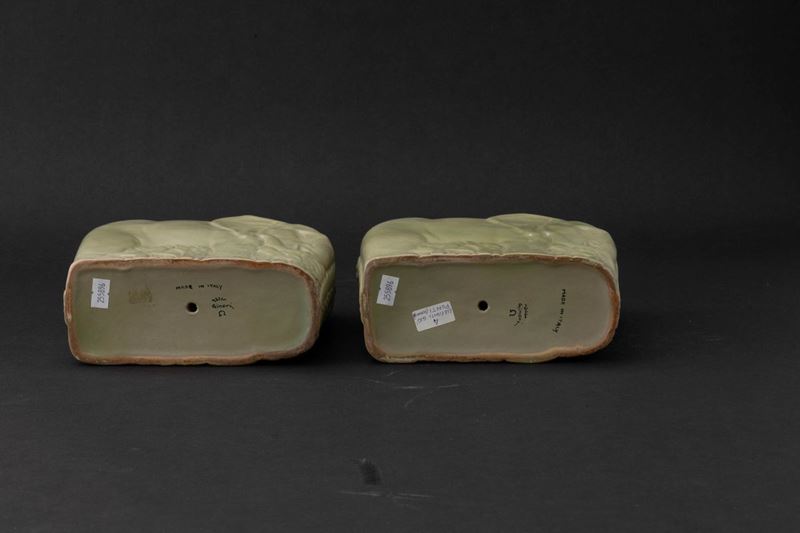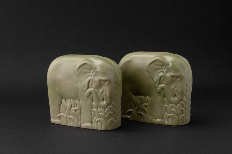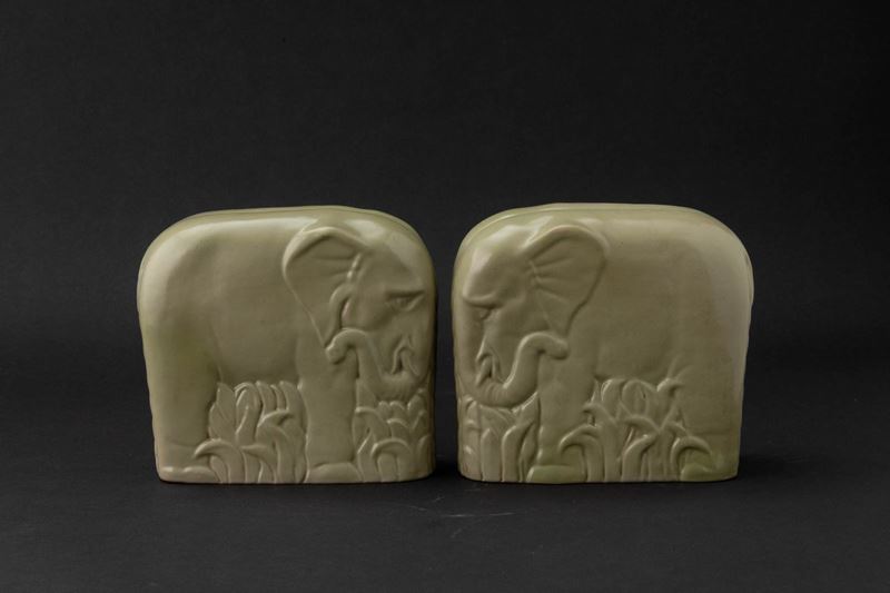 Coppia di fermalibri modellati in forma di elefanti in terracotta maiolicata a smalto céladon