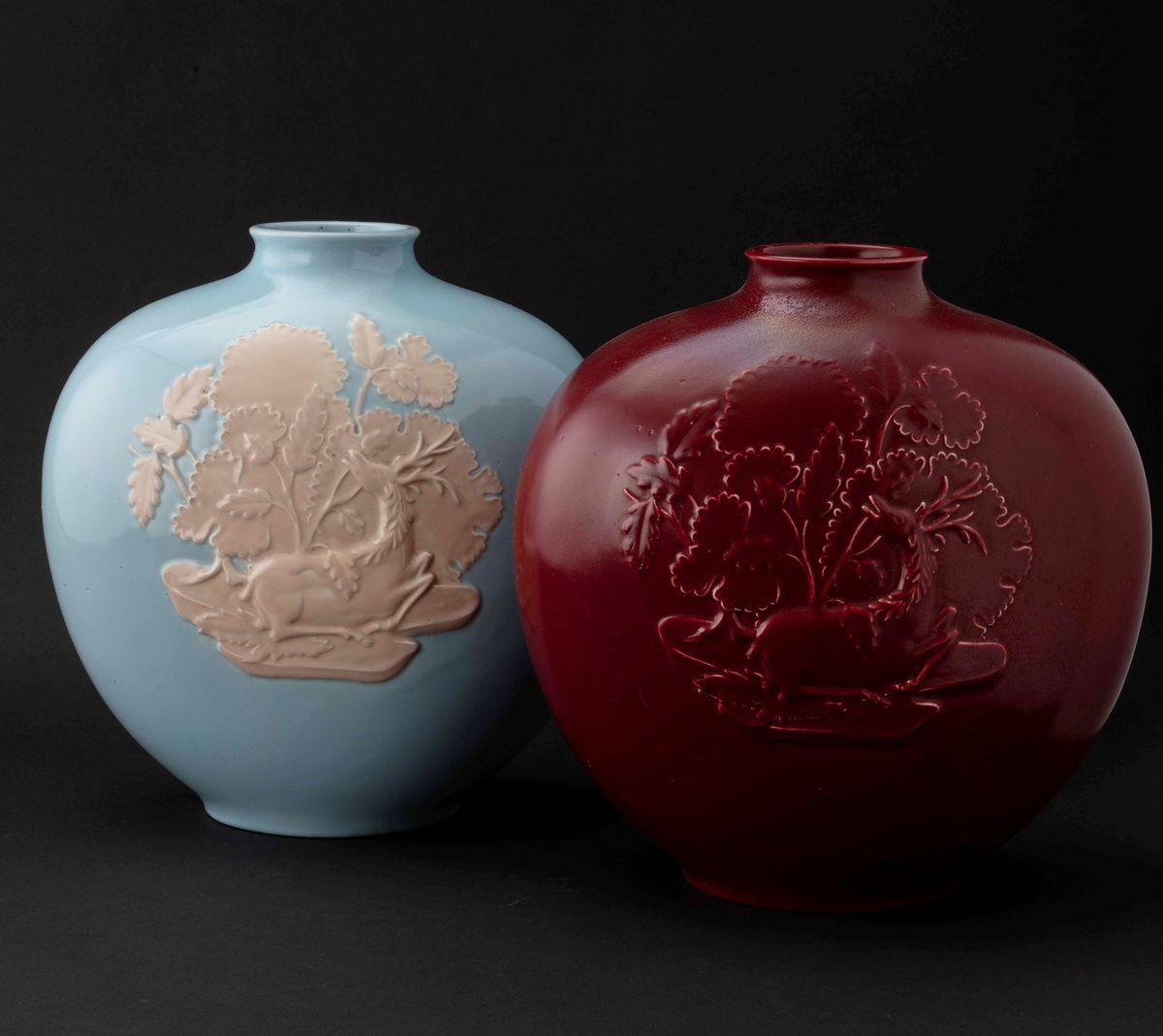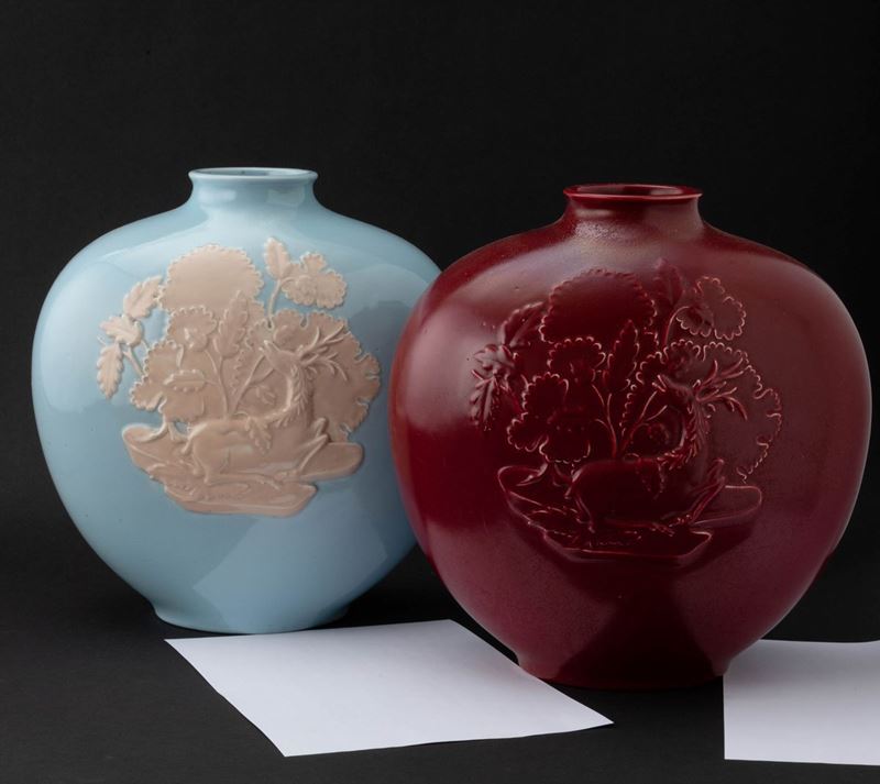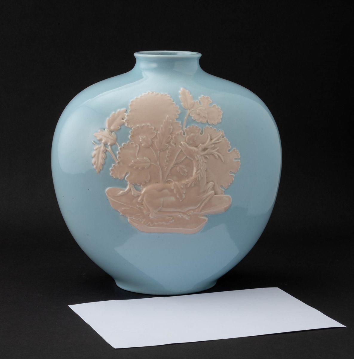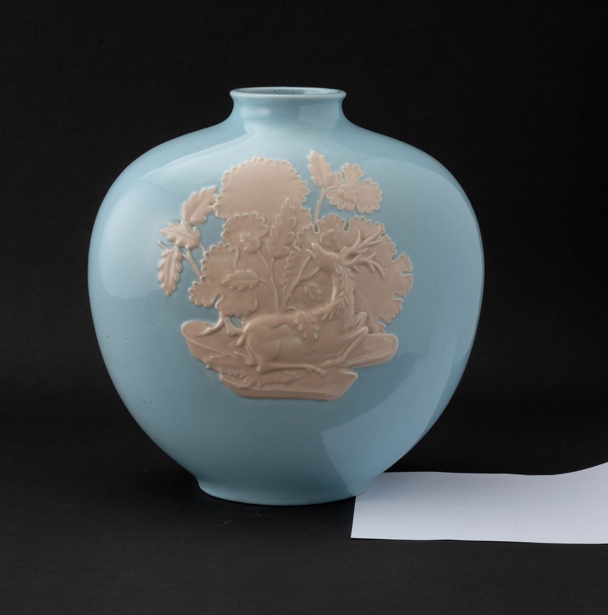Vaso a fiasca Cervo nel bosco in terraglia a colaggio con decoro a rilievi su smalto azzurrino
