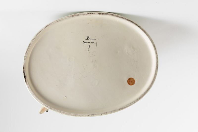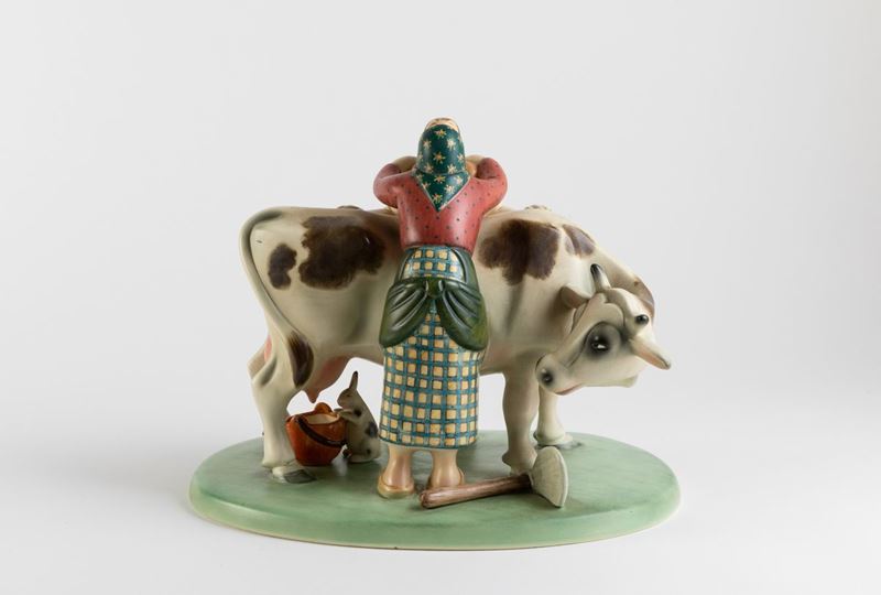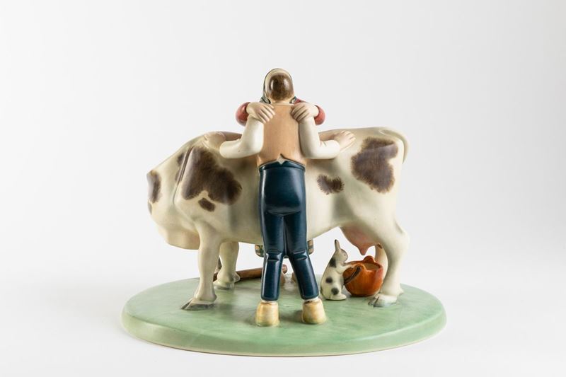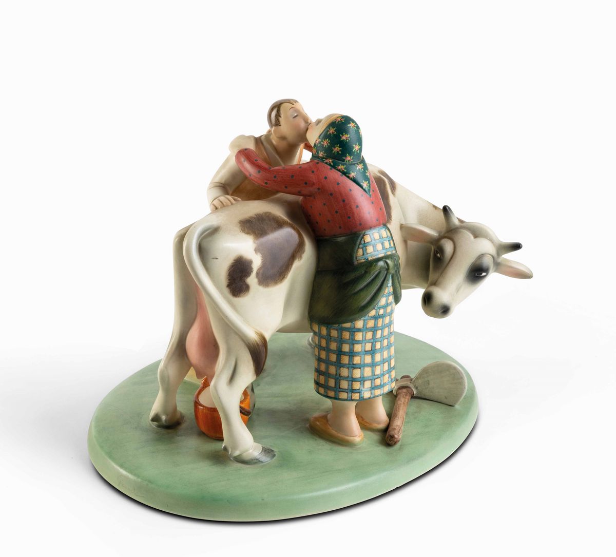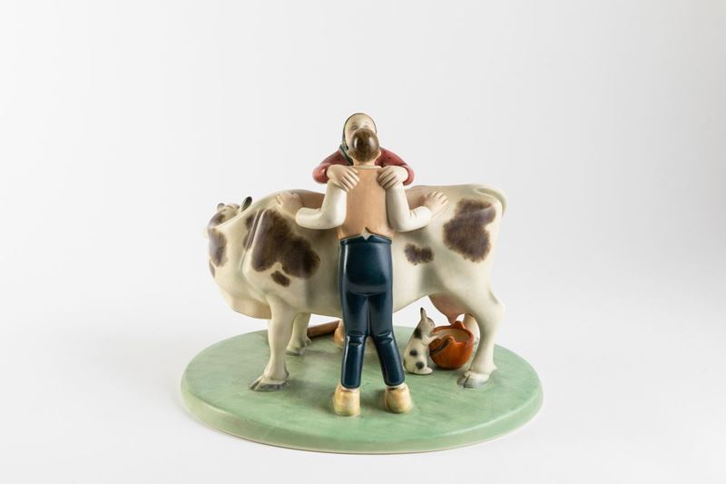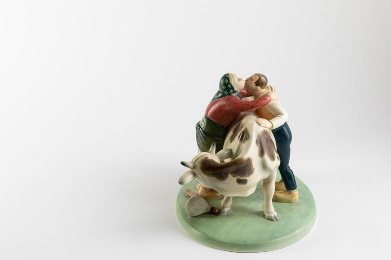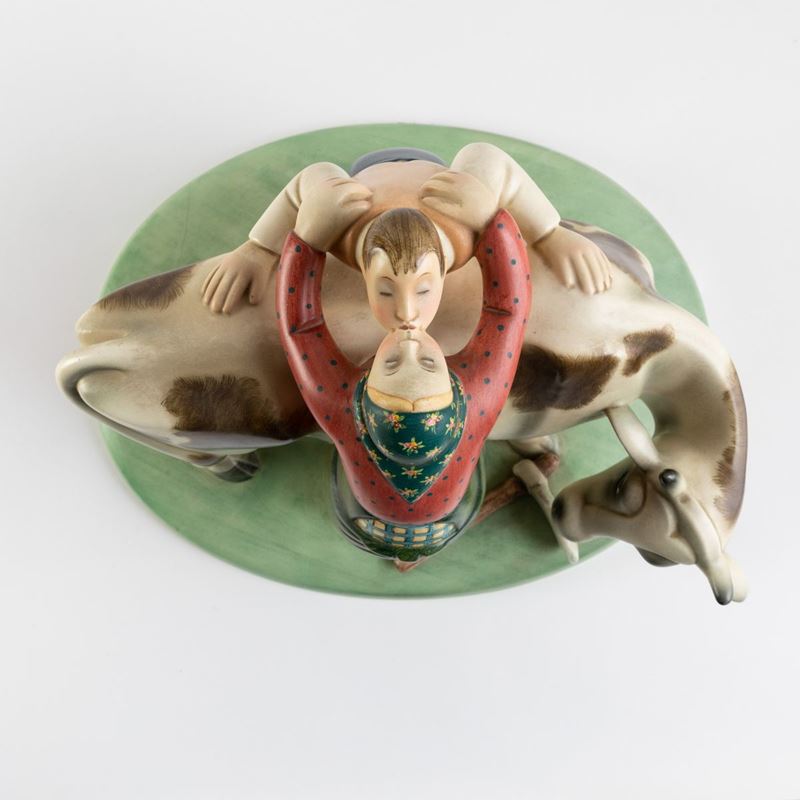 Grande centrotavola ovale raffigurante due contadini che si abbracciano su una mucca in terraglia a colaggio con decoro di smalti policromi.