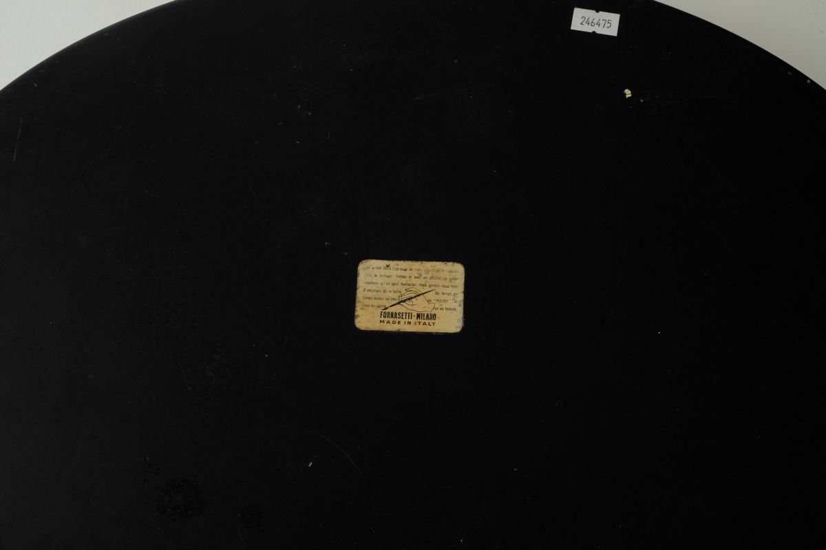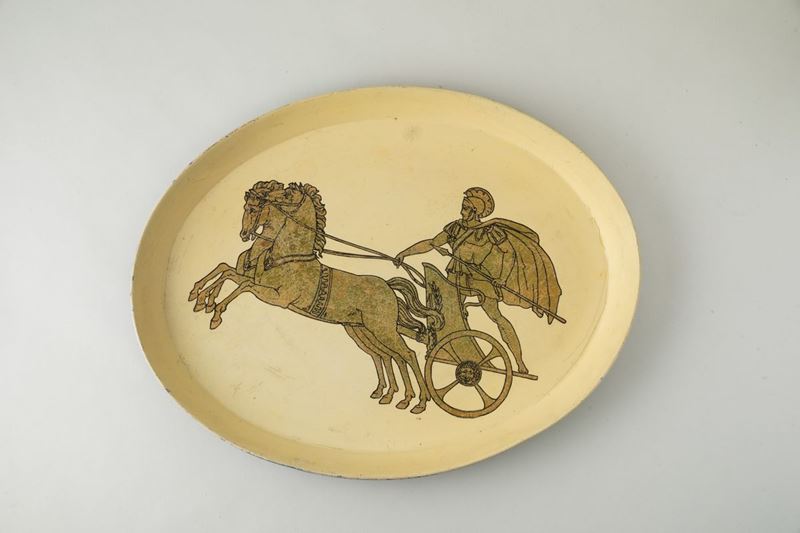 Vassoio ovale in metallo serigrafato con decoro di biga con cavaliere