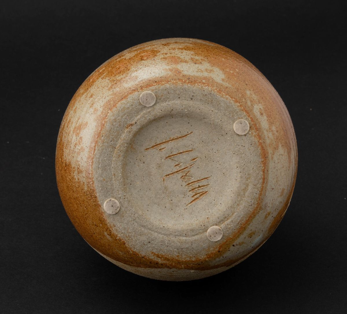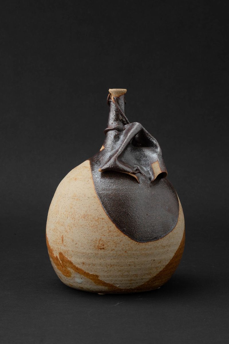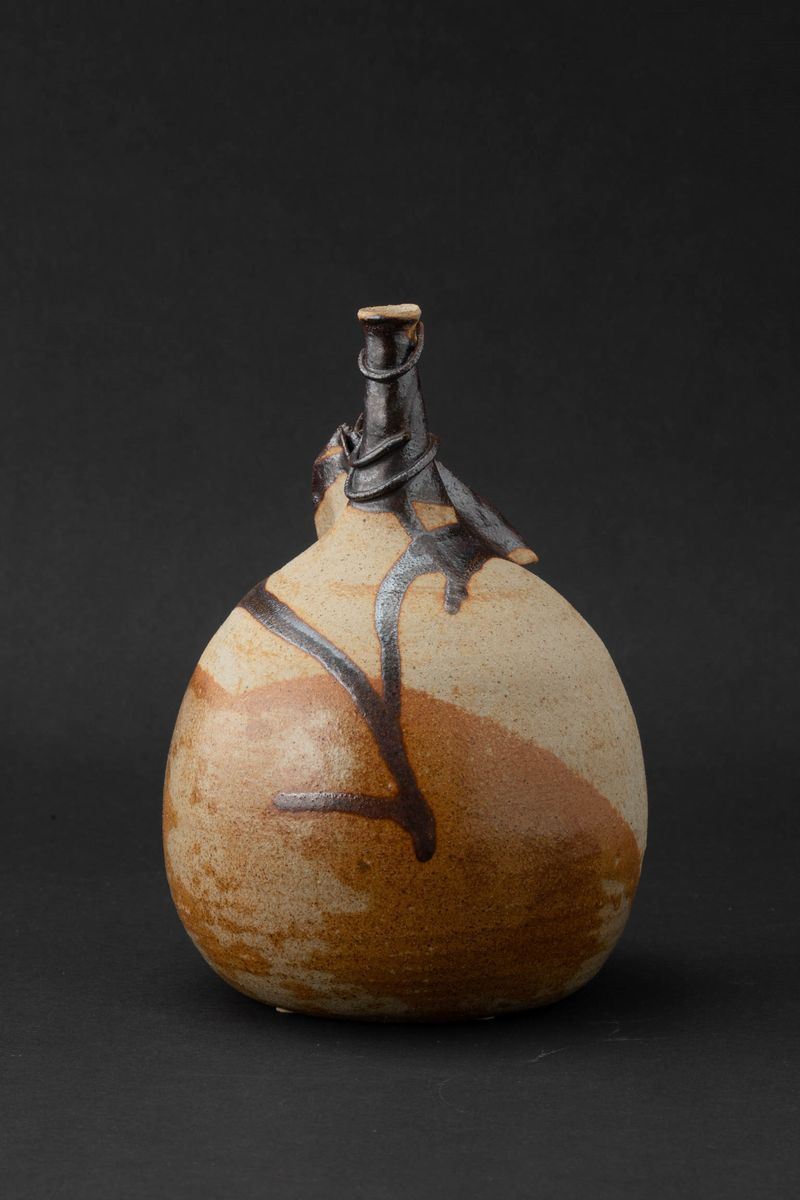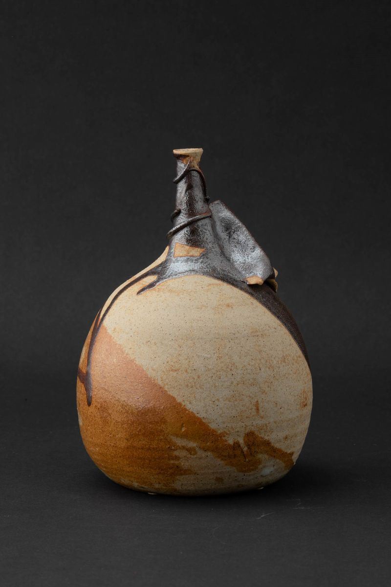 Vaso a forma di bottiglia in grés decorato con smalti colati opachi e lucidi