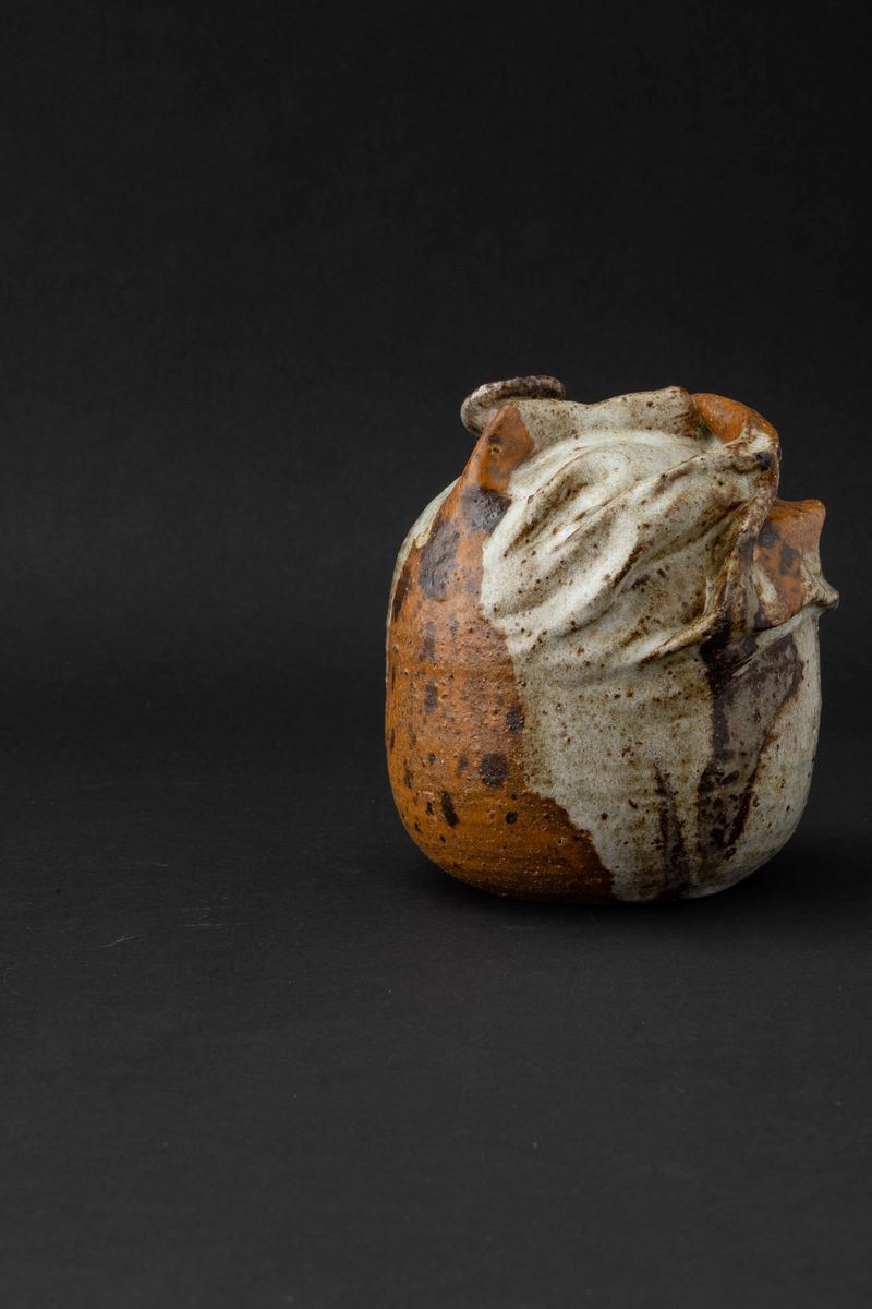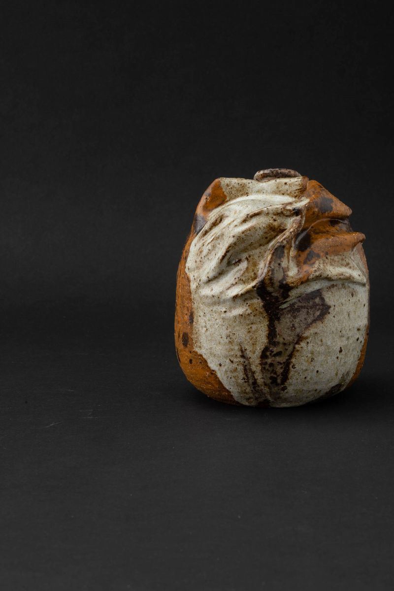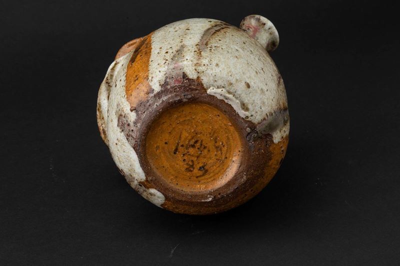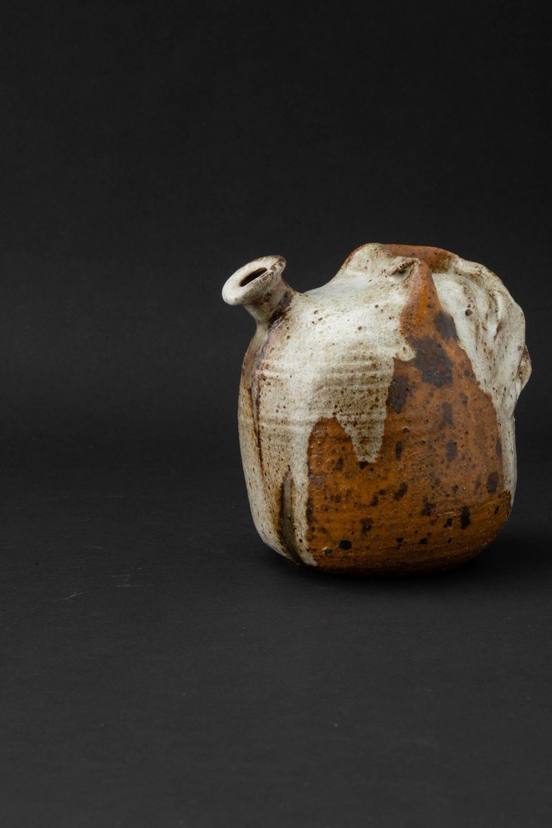 Vaso ad annaffiatoio in grés decorato con smalti colati opachi e lucidi