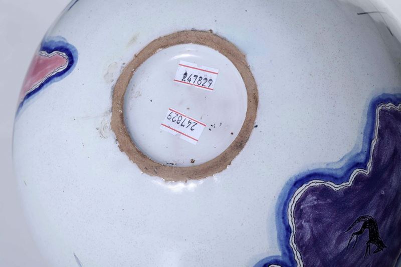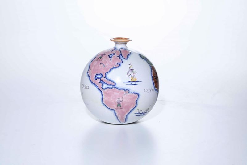 Vaso a sfera con piccolo collo in terracotta maiolicata con decoro di mappamondo a smalti policromi e stella dei venti