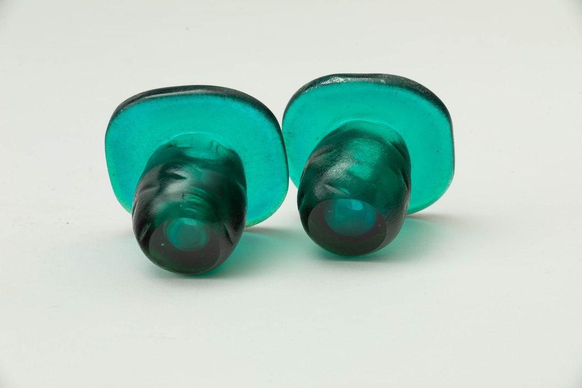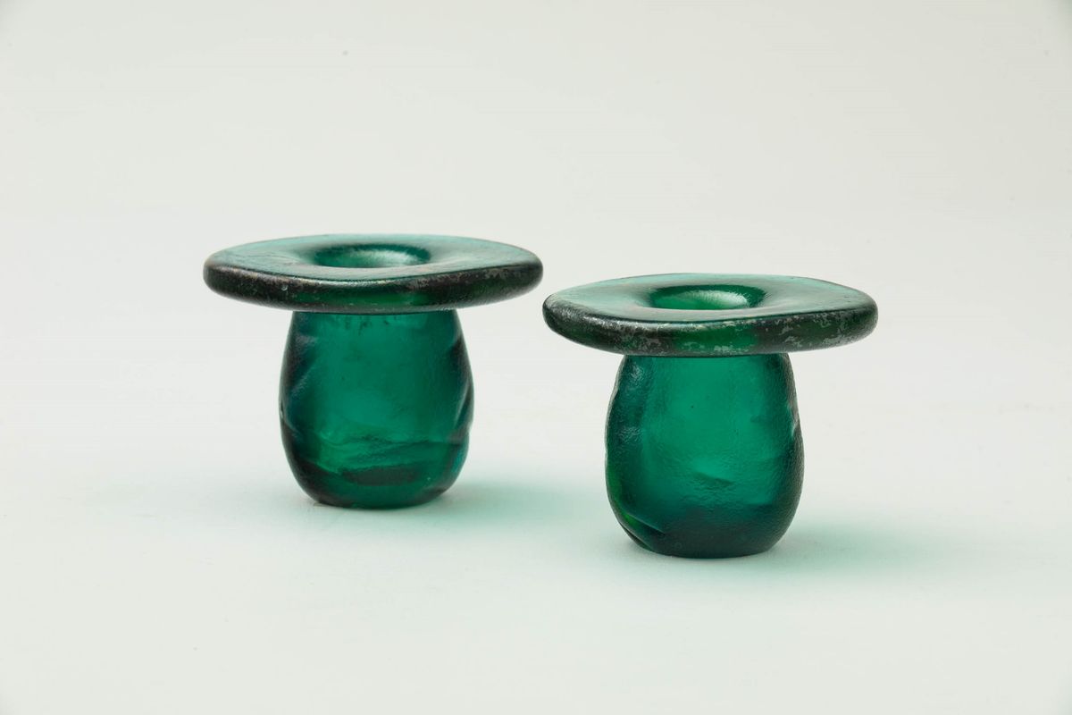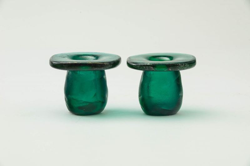 Coppia di porta candele serie Corrosi in vetro verde con superficie interamente iridata e lavorata all'acido