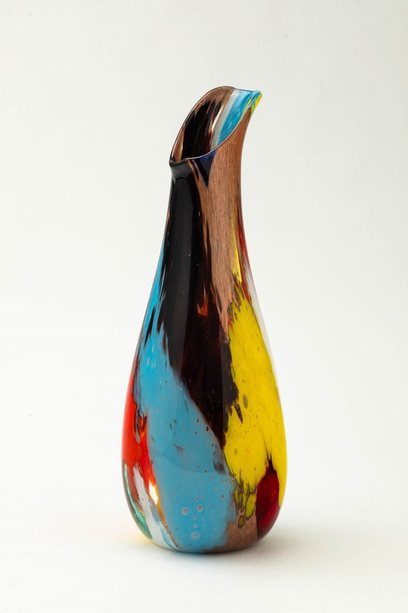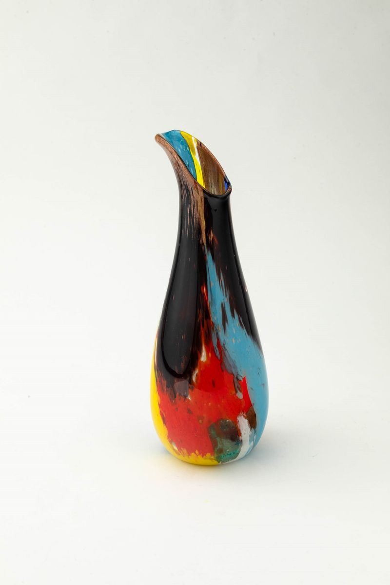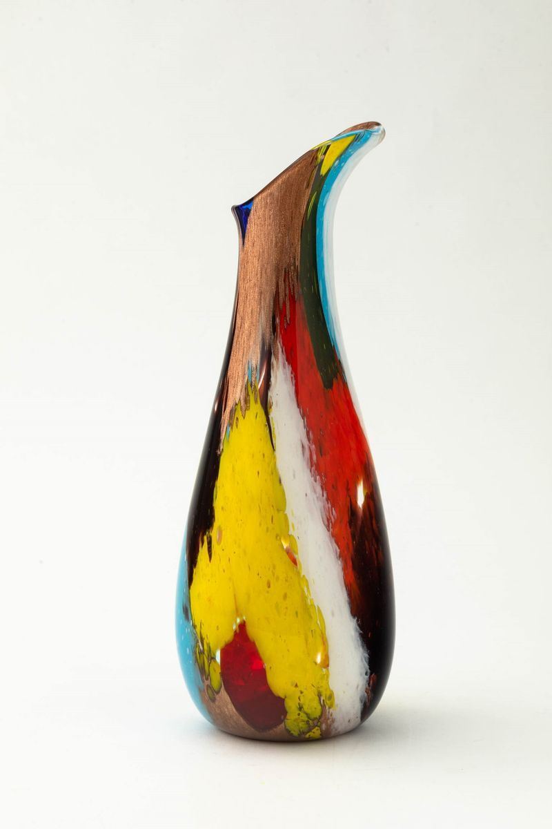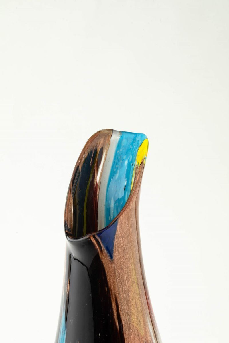 Vaso a goccia serie Oriente con collo a becco e decoro di canne policrome fuse e avventurina