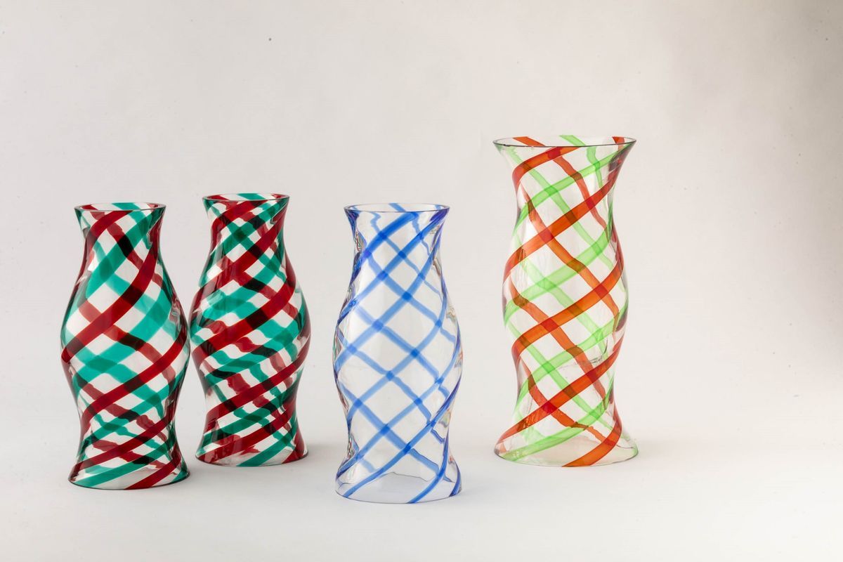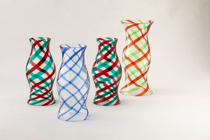 Quattro lampade da tempesta in vetro soffiato con decoro di canne ritorte multicolore