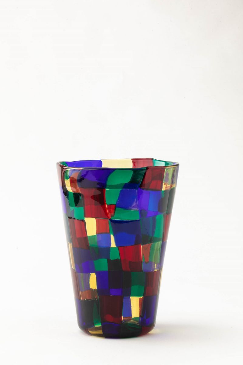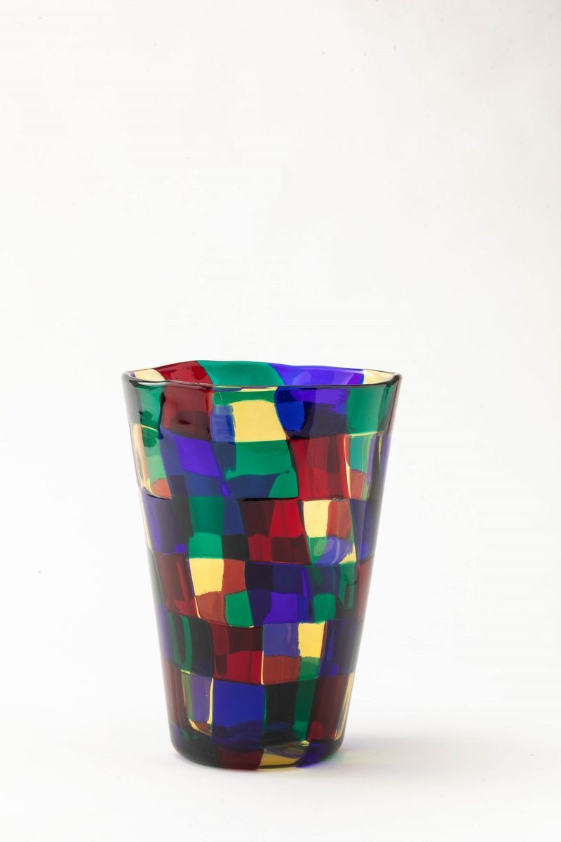 Vaso troncoconico serie Pezzati in vetro soffiato con decoro di tessere multicolori nella variante Parigi