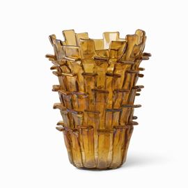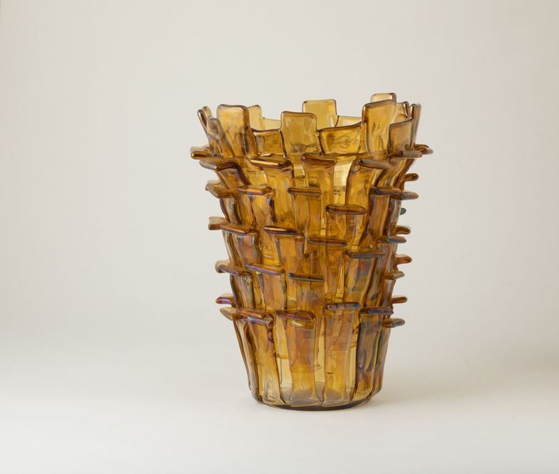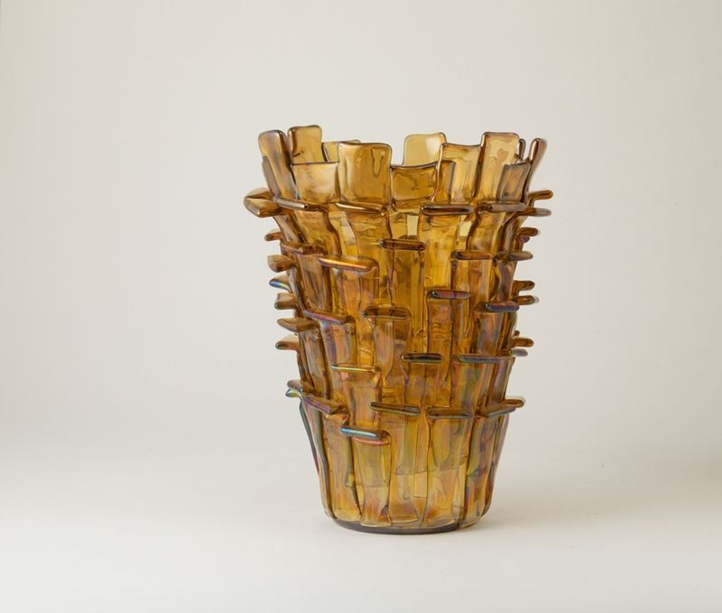 Vaso serie Ritagli in vetro soffiato con decoro di applicazioni a foglia e superficie interamente iridata