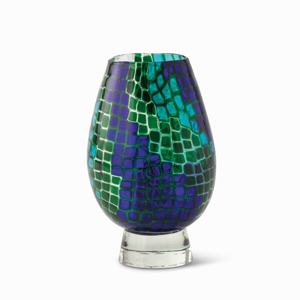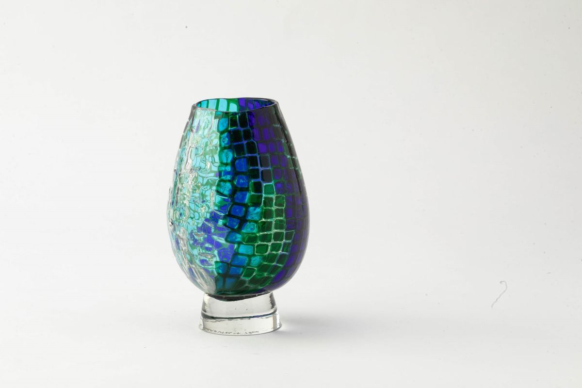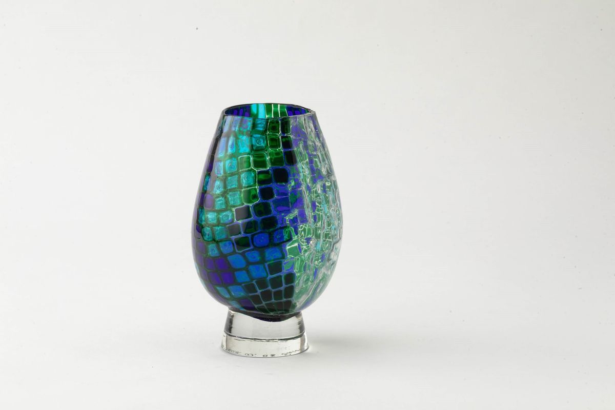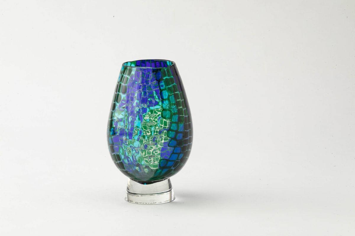 Vaso prototipo a uovo in vetro soffiato a decoro di mosaico di murrine policrome su basamento in vetro pieno