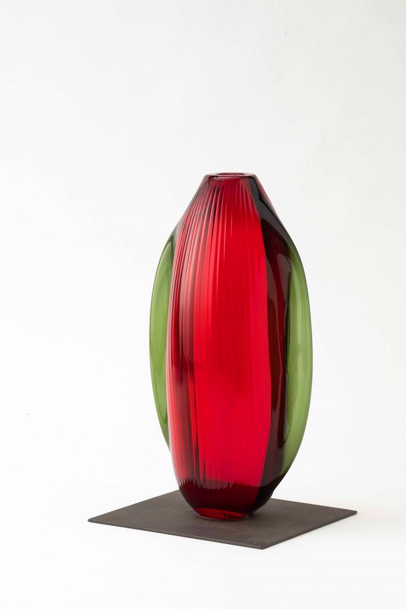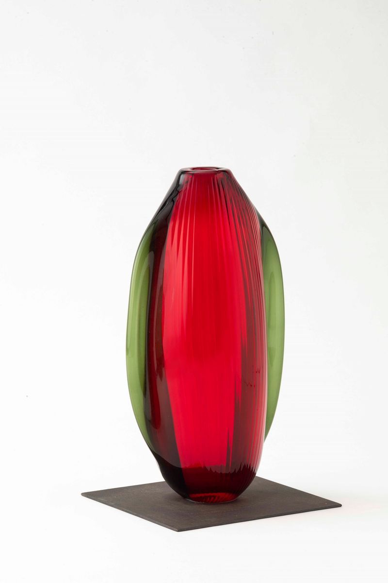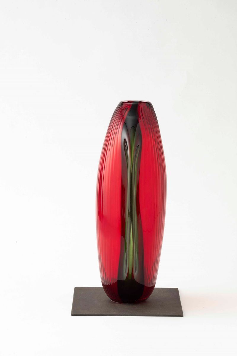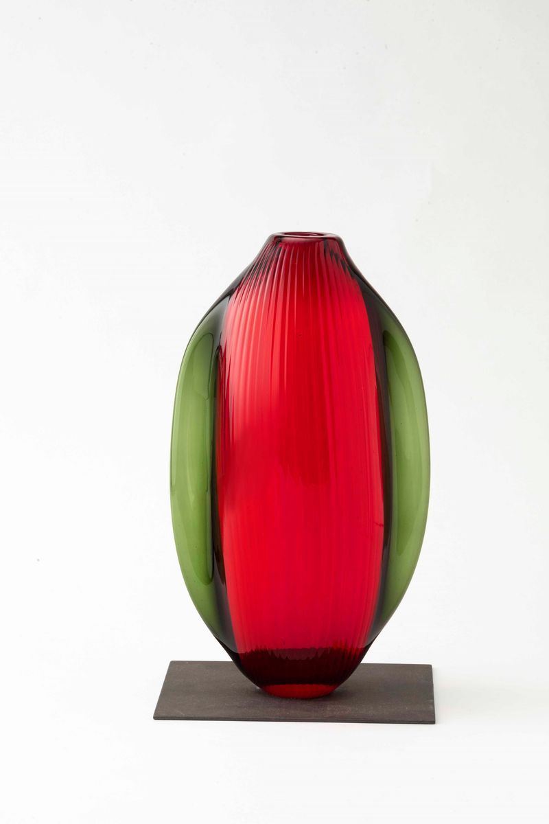 Vaso Patagonia in vetro soffiato a canne rosse con anse verdi su basamento in ferro