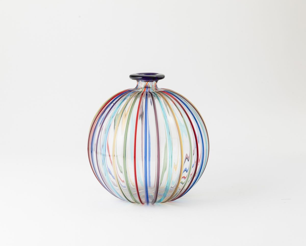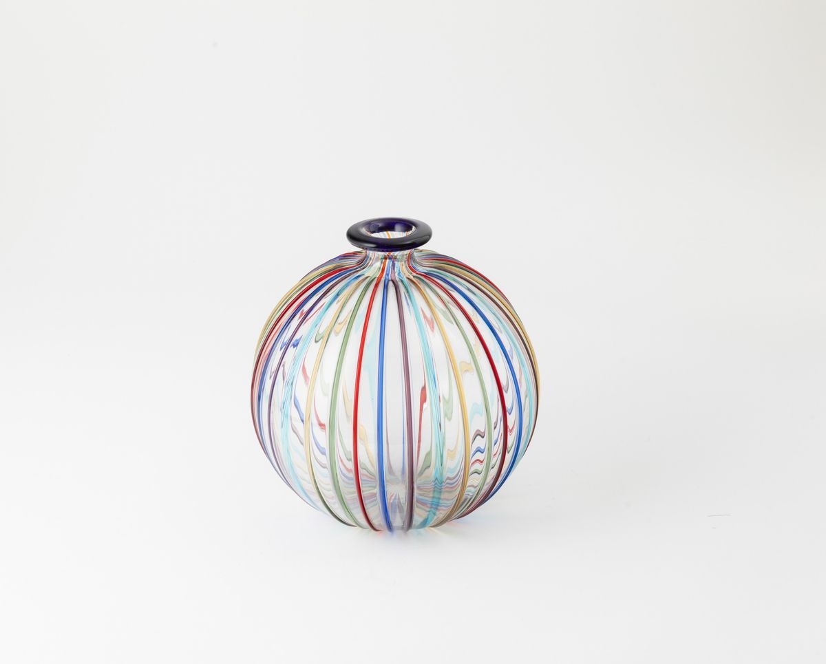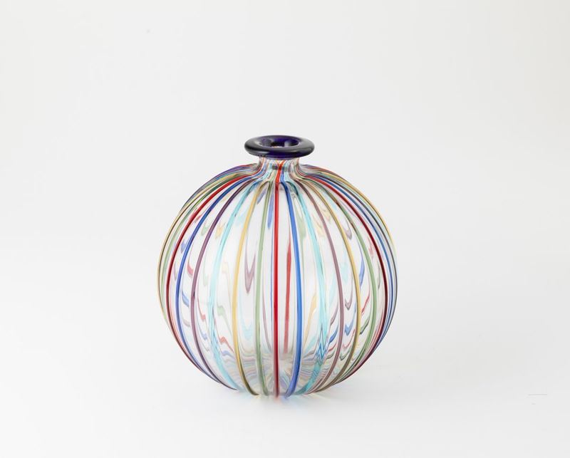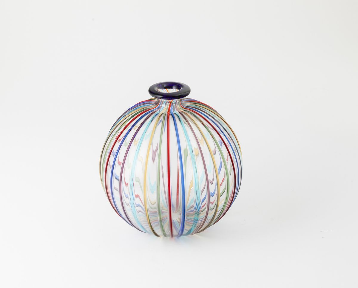 Vaso globulare in vetro soffiato con decoro di canne policrome