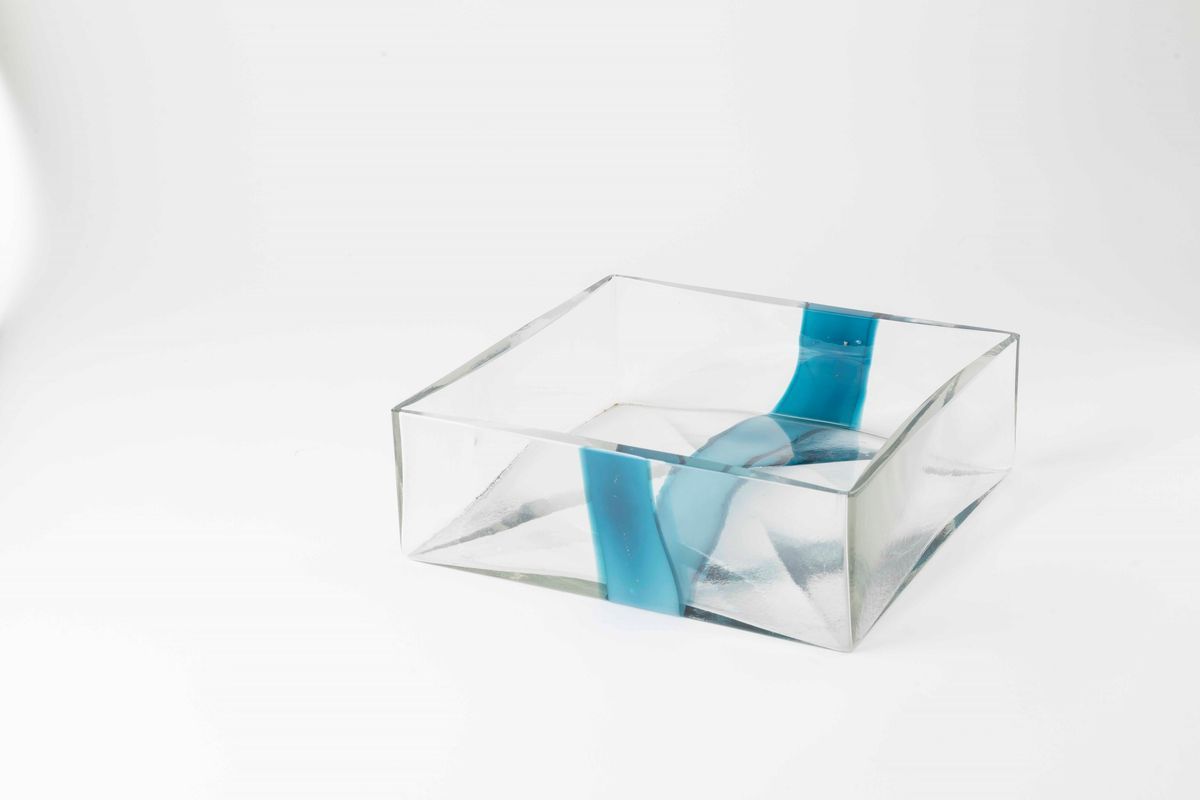 Grande centrotavola quadrato in vetro soffiato a stampo con decoro di fascia in pasta vitrea blu di Prussia