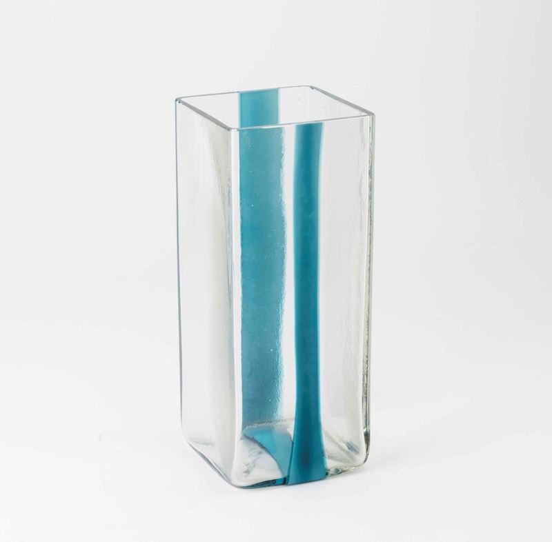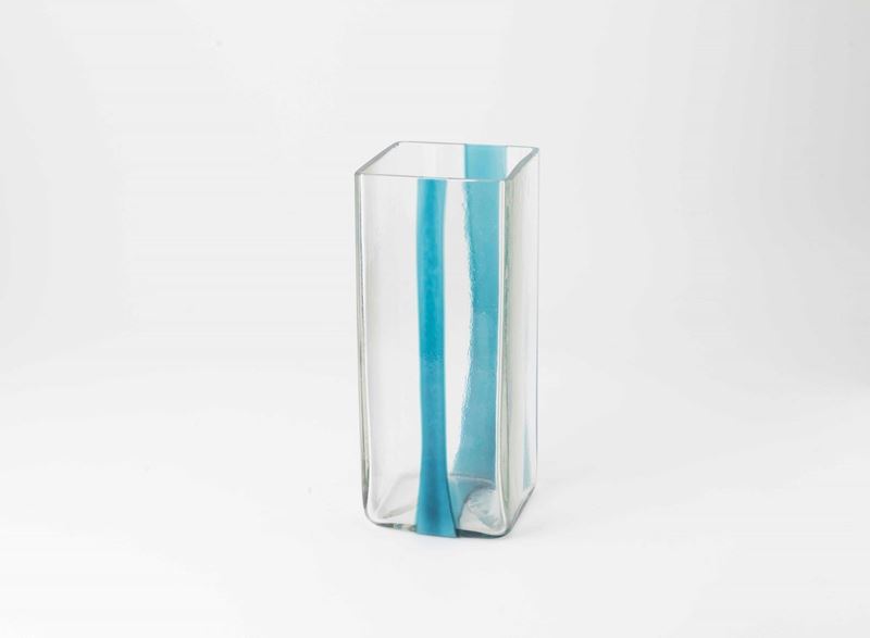 Vaso a parallelepipedo a sezione quadrata in vetro soffiato a stampo con decoro di fascia in pasta vitrea blu di Prussia Firma incisa Venini Pierre Cardin