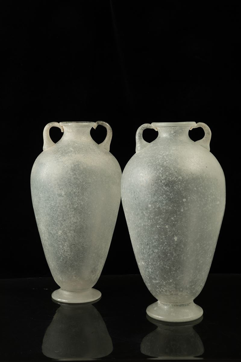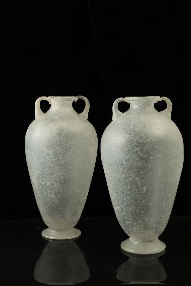 Coppia di vasi ad anfora in vetro a tecnica a scavo con anse e piedi applicati
