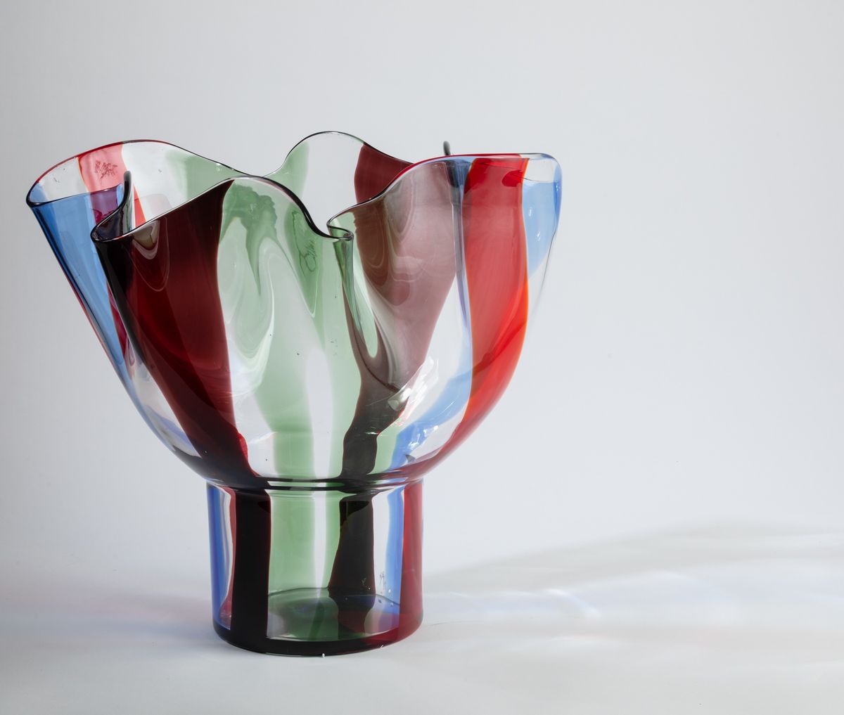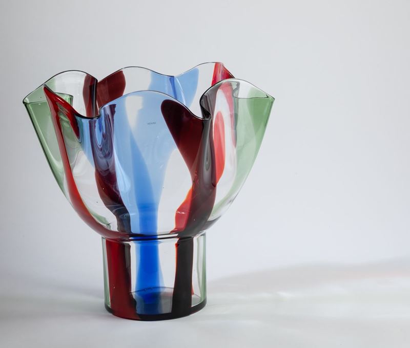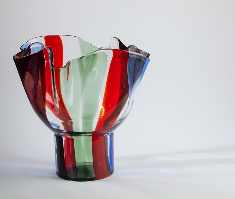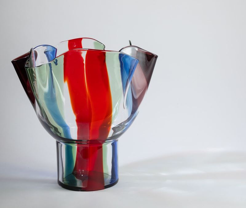 Vaso Kukinto in vetro soffiato a fazzoletto su alto piede con decoro di fasce policrome