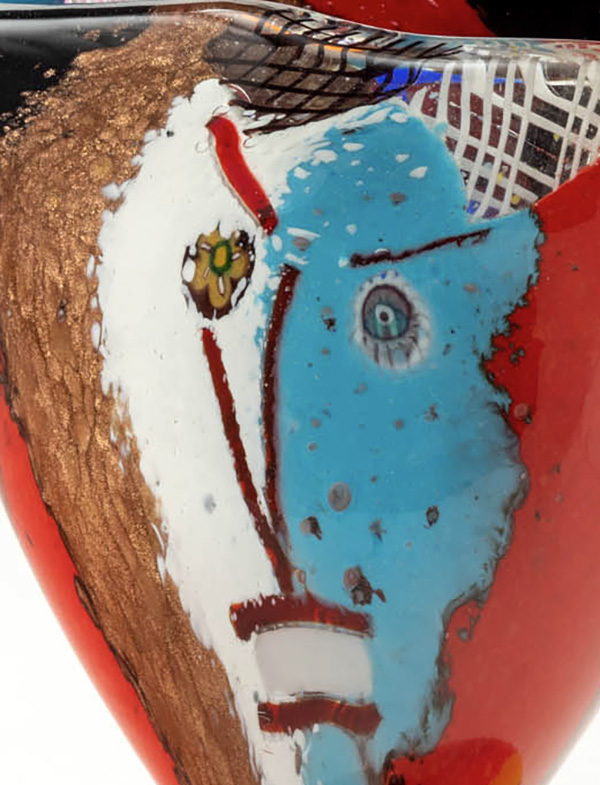 Vaso troncopiramidale serie Pezzati in vetro soffiato con decoro di tessere multicolori nella variante Istanbul Firma all’acido Venini Murano Italia