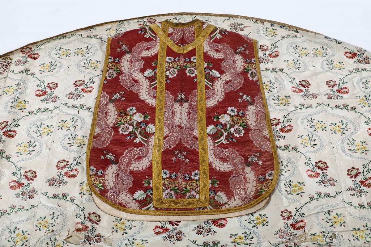 Piviale bianco con decoro floreale bordato in oro, pianeta e stola rossa con decori floreali proffiata in oro