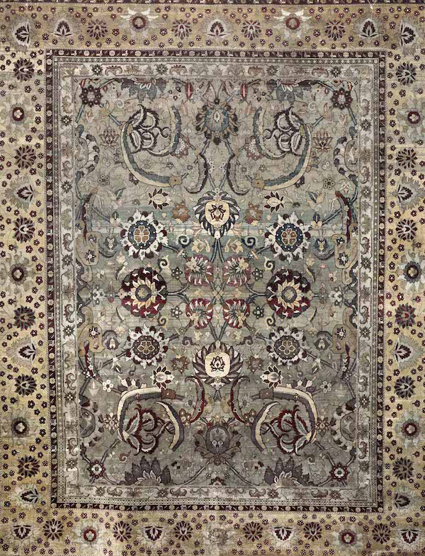particolare il campo con file di garofani stilizzati multicolori, bordura principale decorata con il motivo “running dog”,