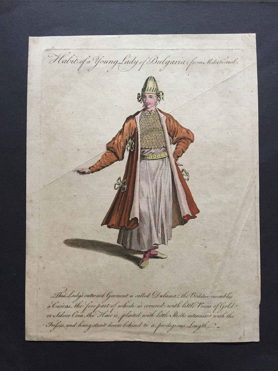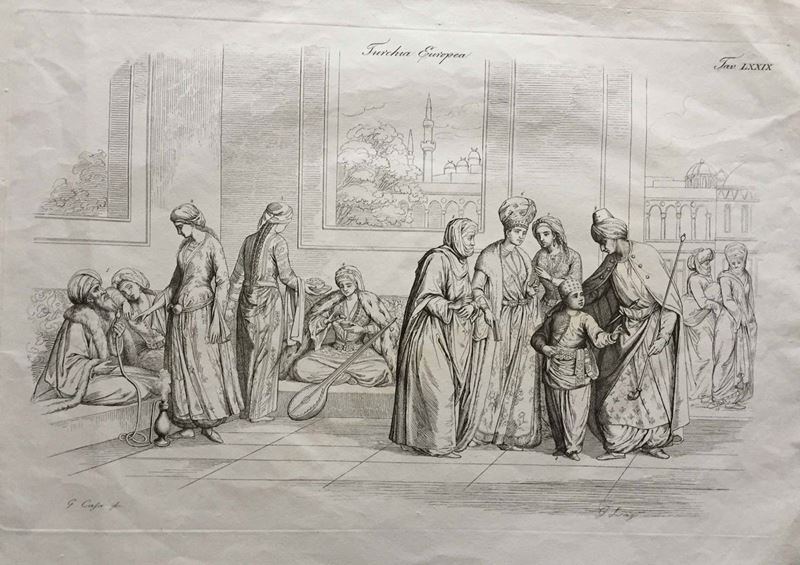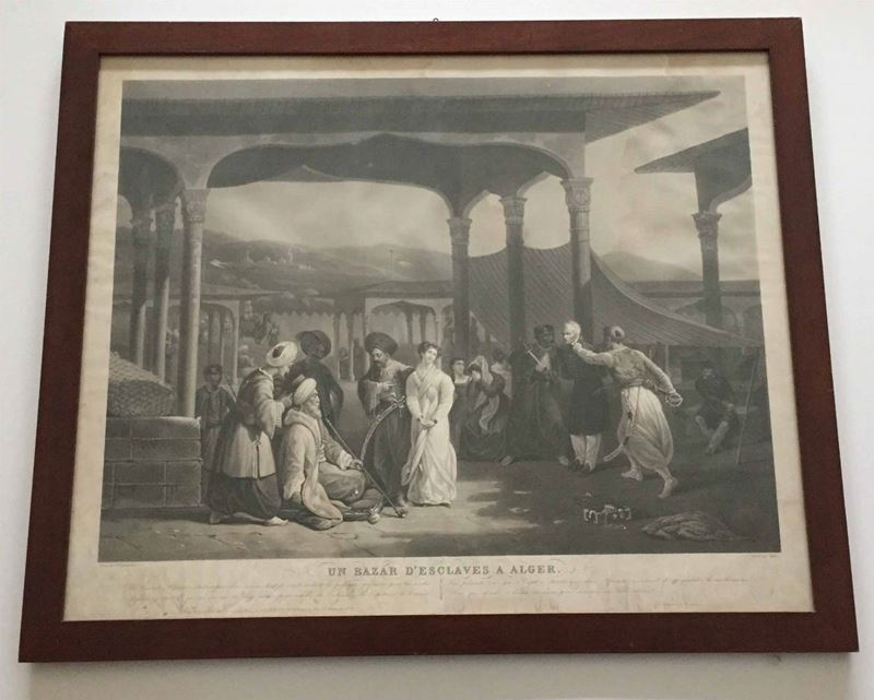 Il lotto include una grande stampa in cornice rappresentante il “Mercato degli schiavi ad Algeri” (misure cornice Cm 51,5 x 61,5 - alcune macchie), altra stampa con ambiente turco (cm 48 x 33 ) e 13 di formato più piccolo, tre delle quali colorate a mano.