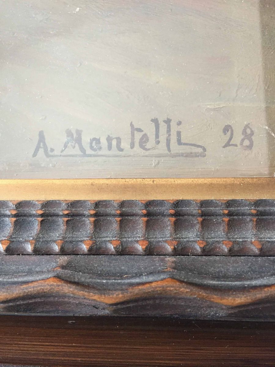 olio su compensato entro bella cornice guillochè. Firmato e datato in basso a destra A. Mantelli 28 Misure dell’opera cm 67 x 62 Inclusa cornice cm 80 x 87