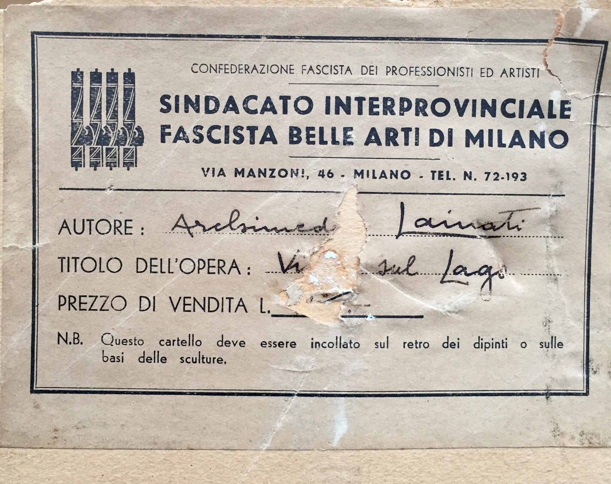 Olio su supporto non ispezionato. Il quadro riporta sul retro l’etichetta di esposizione del Sindacato Interprovinciale Fascista Belle Arti di Milano e conserva ancora la bella cornice originale “a becco di civetta” con cui venne esposto negli anni 30.