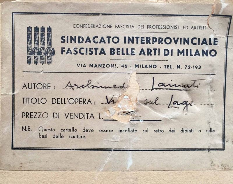 Il Lainati espose alle Permanenti del 1937, del 1938, del 1939, del 1940. Espose inoltre alla Sindacale del 1939 e alla Prima Mostra Nazionale di Arte Sacra che si tenne all’Angelicum di Miano tra l’Aprile e il Giugno del 1944. Misure: opera cm 50 x 40 ca; con cornice cm 50 x 40