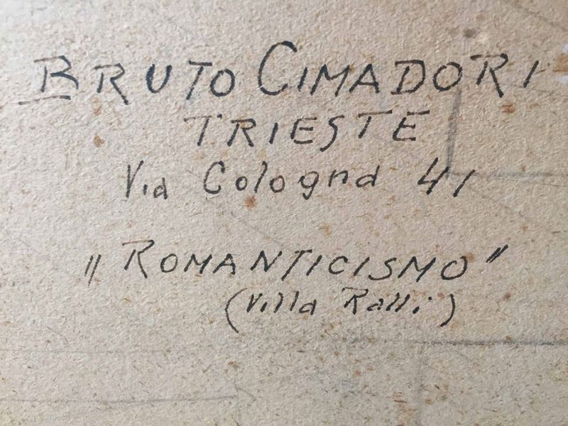 Olio su cartone firmato in basso al centro e iscritto sul retro “Bruto Cimadori/ Trieste Via Cologna 41, “Romanticismo”(Villa Ralli)” in cornice artigiana dell’epoca. Misure opera cm 55 x 40. Inclusa cornice cm 70 x 60.