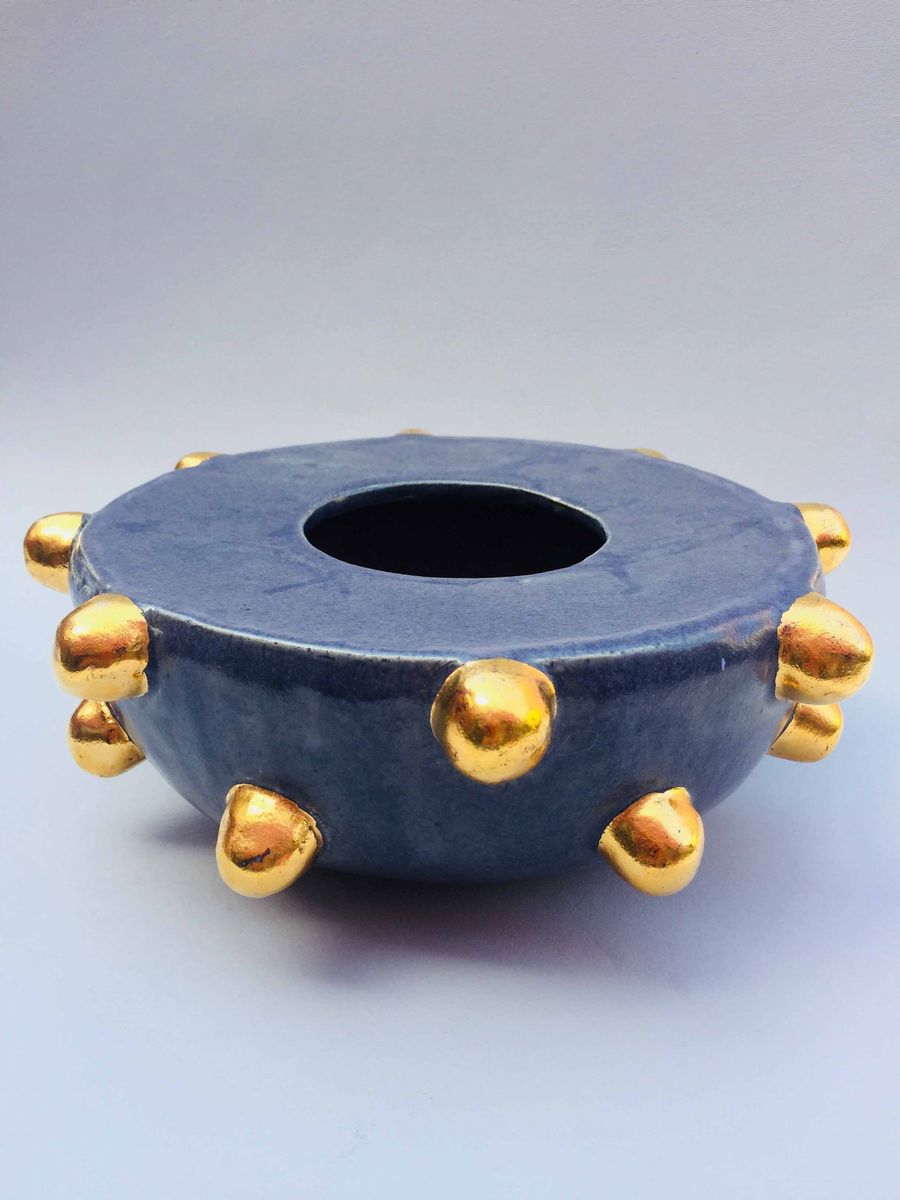 Vaso col corpo dipinto in azzurro con protuberanze globulari dorate Larghezza cm 26, altezza cm 9,5. Pezzo unico.