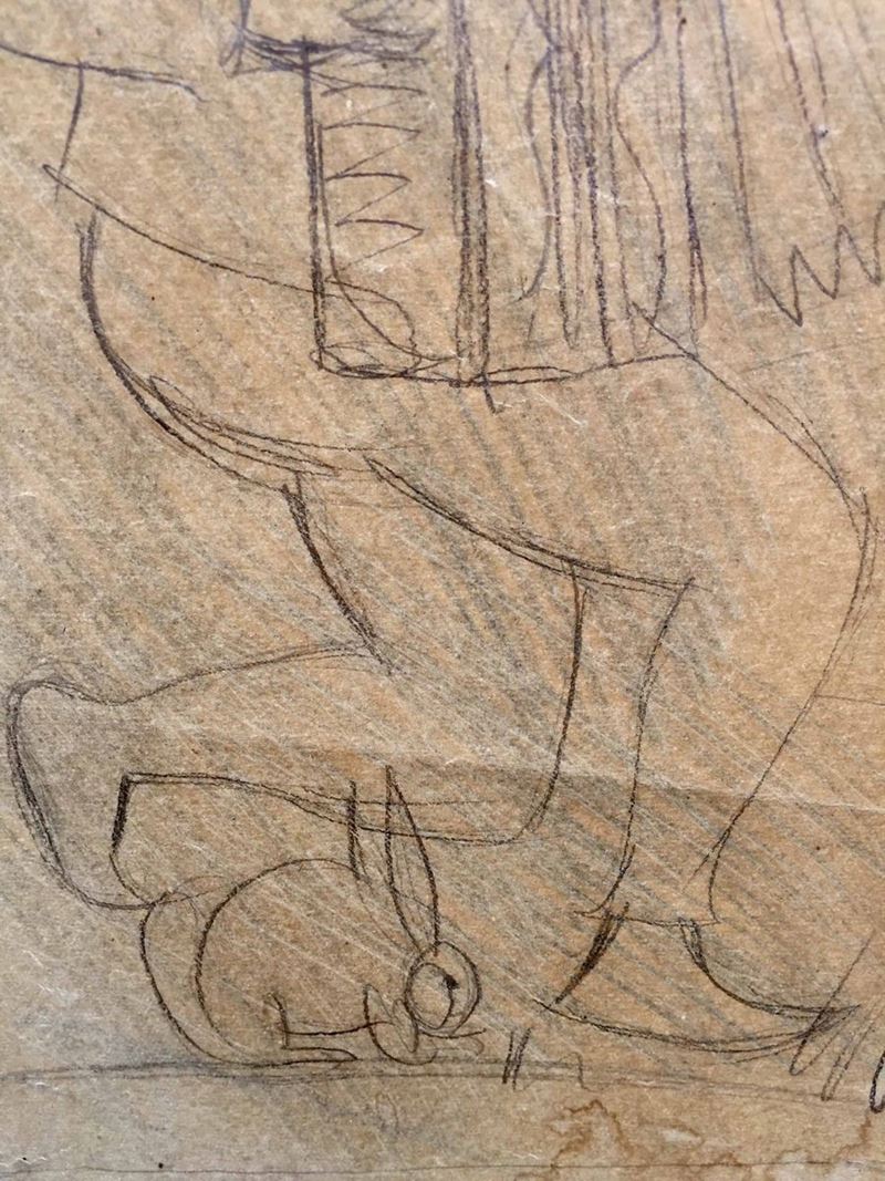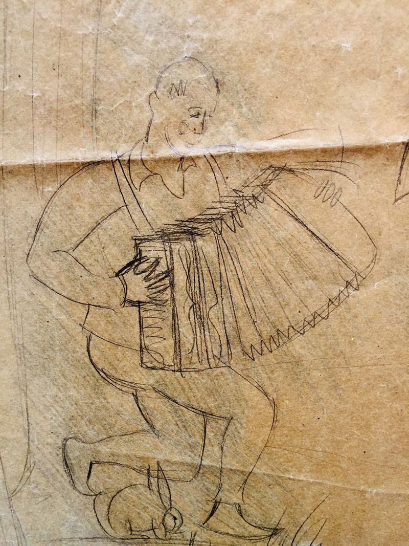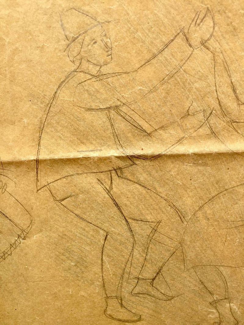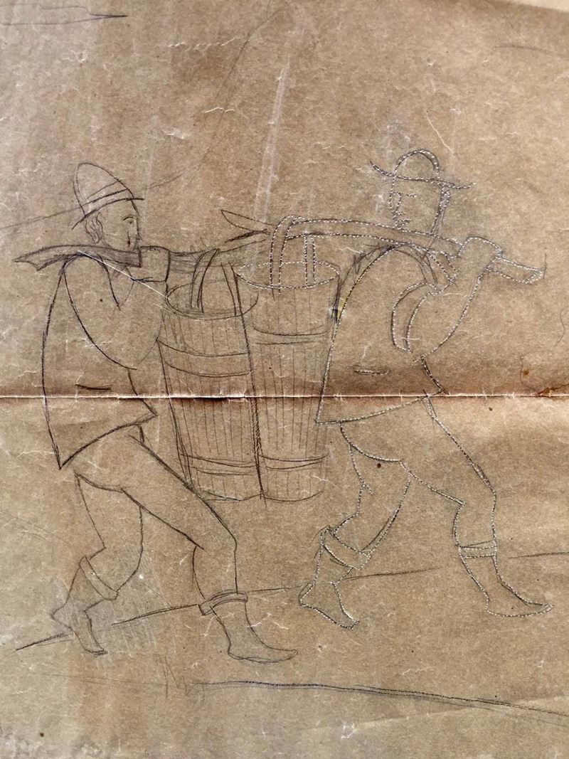 Grande lucido da spolvero (cm 98 x 60) raffigurante una festa campestre. Anni 30. Tra le figure: due portatori di tini, un suonatore di fisarmonica con una lepre ai suoi piedi, una coppia che danza, una ragazza che, con l’aiuto di una scala, raccoglie frutta da un albero. Il lucido è stato in parte utilizzato, come si evince dai fori che segnano alcune figure. La composizione, la tipologia delle figure (si notino i portatori di tini) che si ritrovano simili in altre opere di Gio Ponti ci autorizzano a ritenere che l’ideazione della composizione possa essere opera del grande architetto