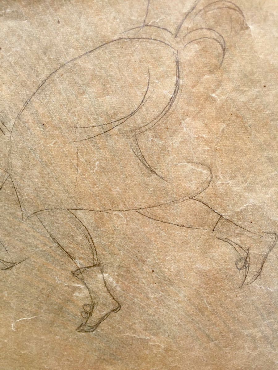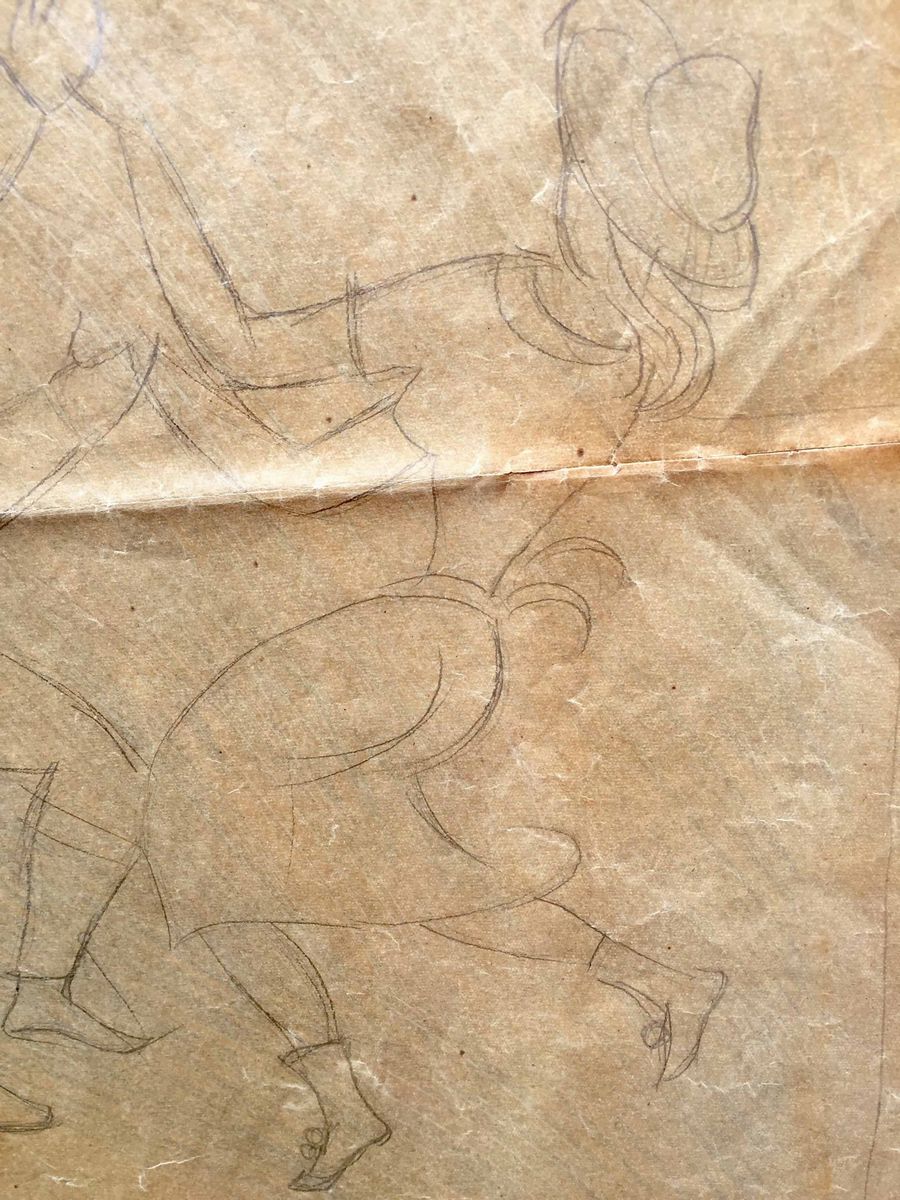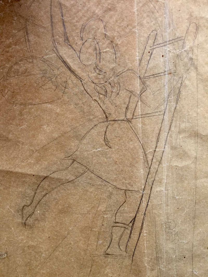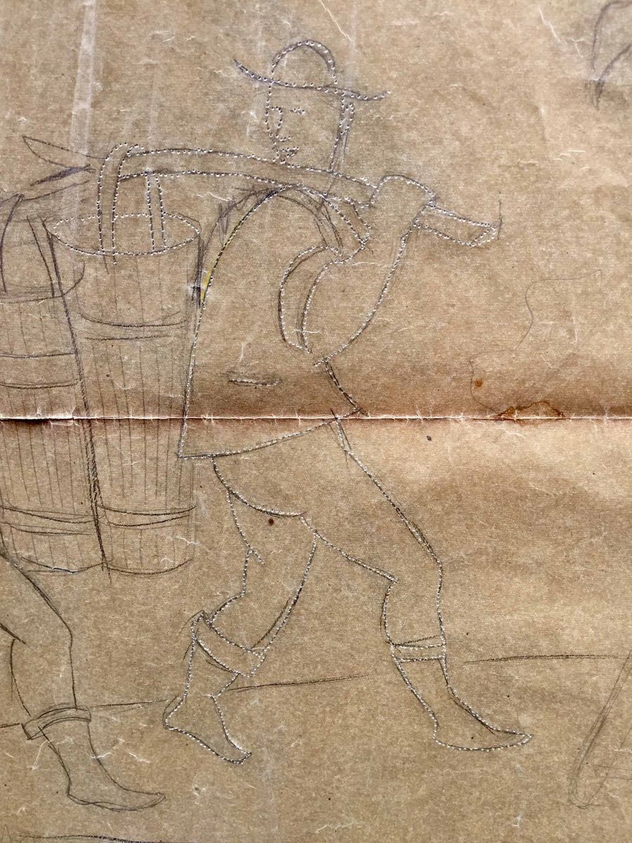 Grande lucido da spolvero (cm 98 x 60) raffigurante una festa campestre. Anni 30. Tra le figure: due portatori di tini, un suonatore di fisarmonica con una lepre ai suoi piedi, una coppia che danza, una ragazza che, con l’aiuto di una scala, raccoglie frutta da un albero. Il lucido è stato in parte utilizzato, come si evince dai fori che segnano alcune figure. La composizione, la tipologia delle figure (si notino i portatori di tini) che si ritrovano simili in altre opere di Gio Ponti ci autorizzano a ritenere che l’ideazione della composizione possa essere opera del grande architetto