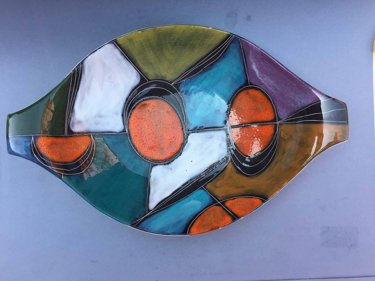 Vassoio decorato con motivi geometrici Lunghezza cm 34,5, larghezza cm 24, altezza cm 9,5 Qualche lievissima sbeccatura sui bordi