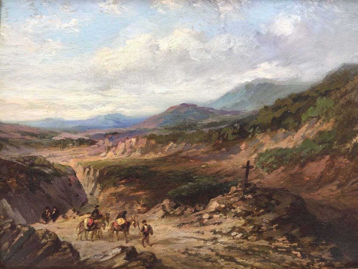 Pittore dell'800, Viandanti in un paesaggio, olio su tavola
