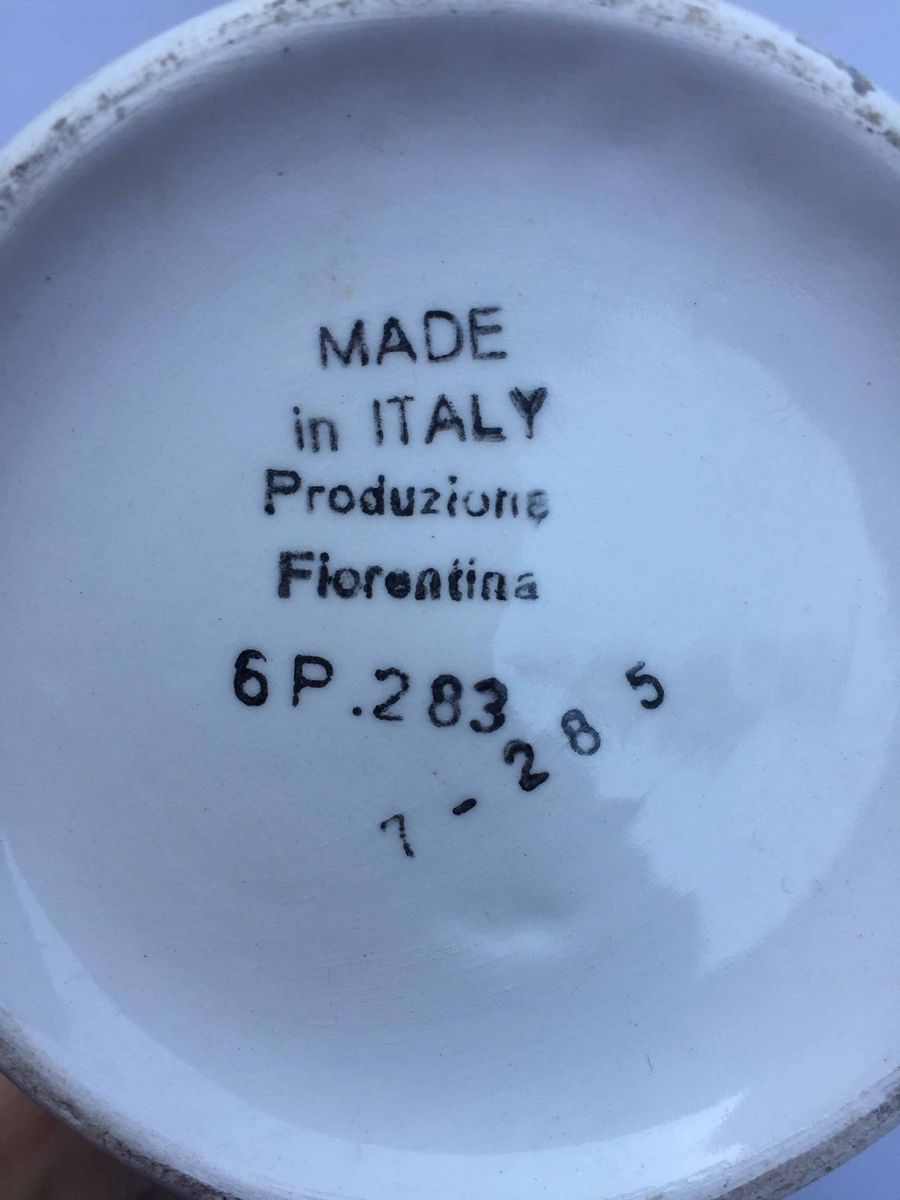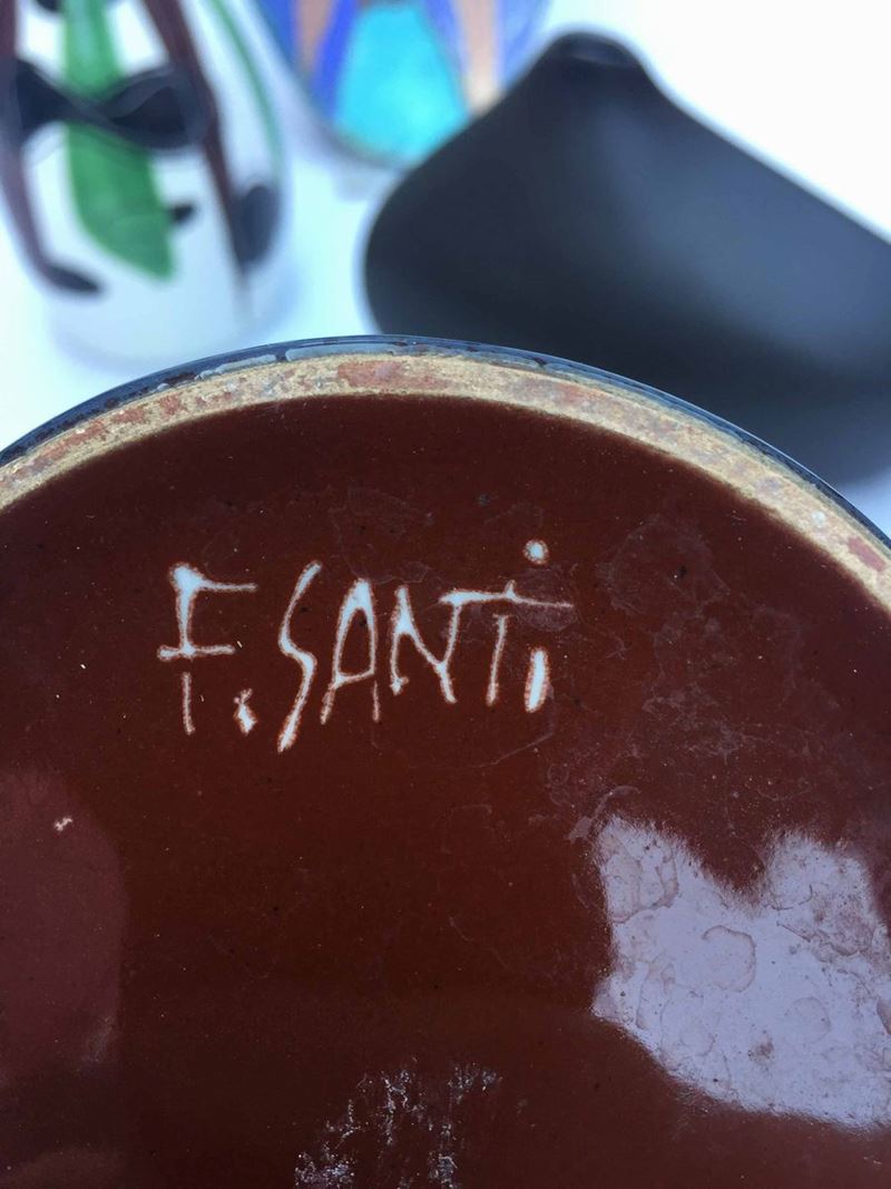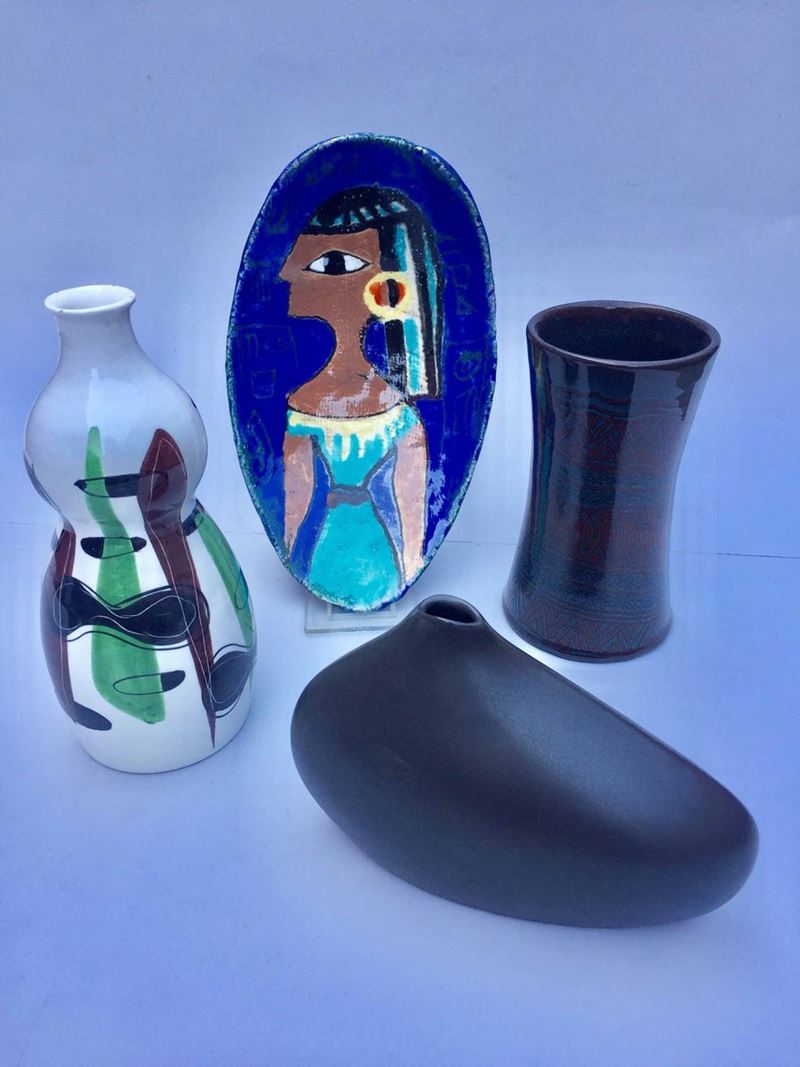 tre firmate Vaschetta “egizia” retrofirmata cm 23,5 x cm 14; vasetti altezza cm 19,5 e 15,5, uno firmato Produzione Fiorentina, l’altro F.Santi; ceramica smaltata in nero: larghezza cm 17 x 11,5 di altezza