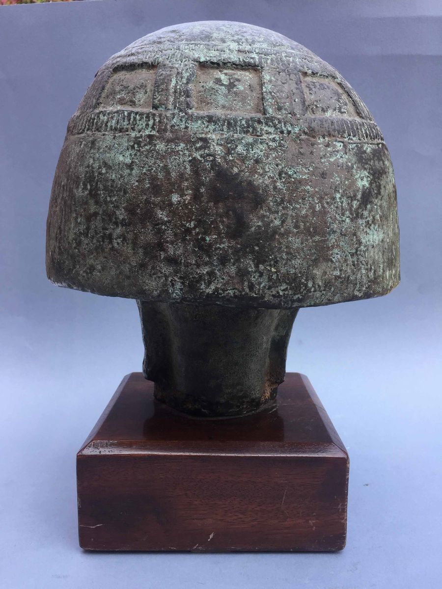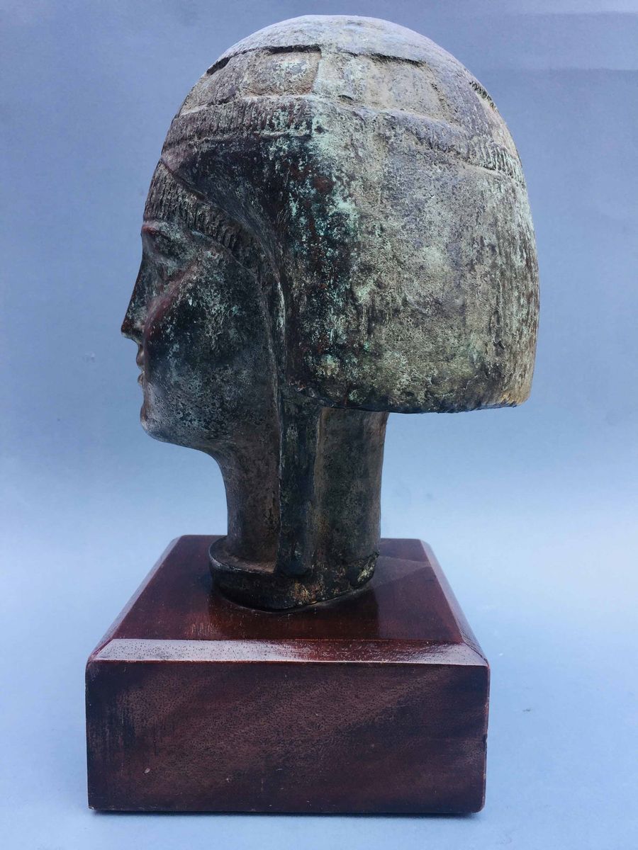 Testa femminile ispirata al mondo egizio Bronzo patinato in verde, su bello zoccolo in legno scuro Altezza totale cm 31,5; solo bronzo cm 24,5; larghezza cm 21,5